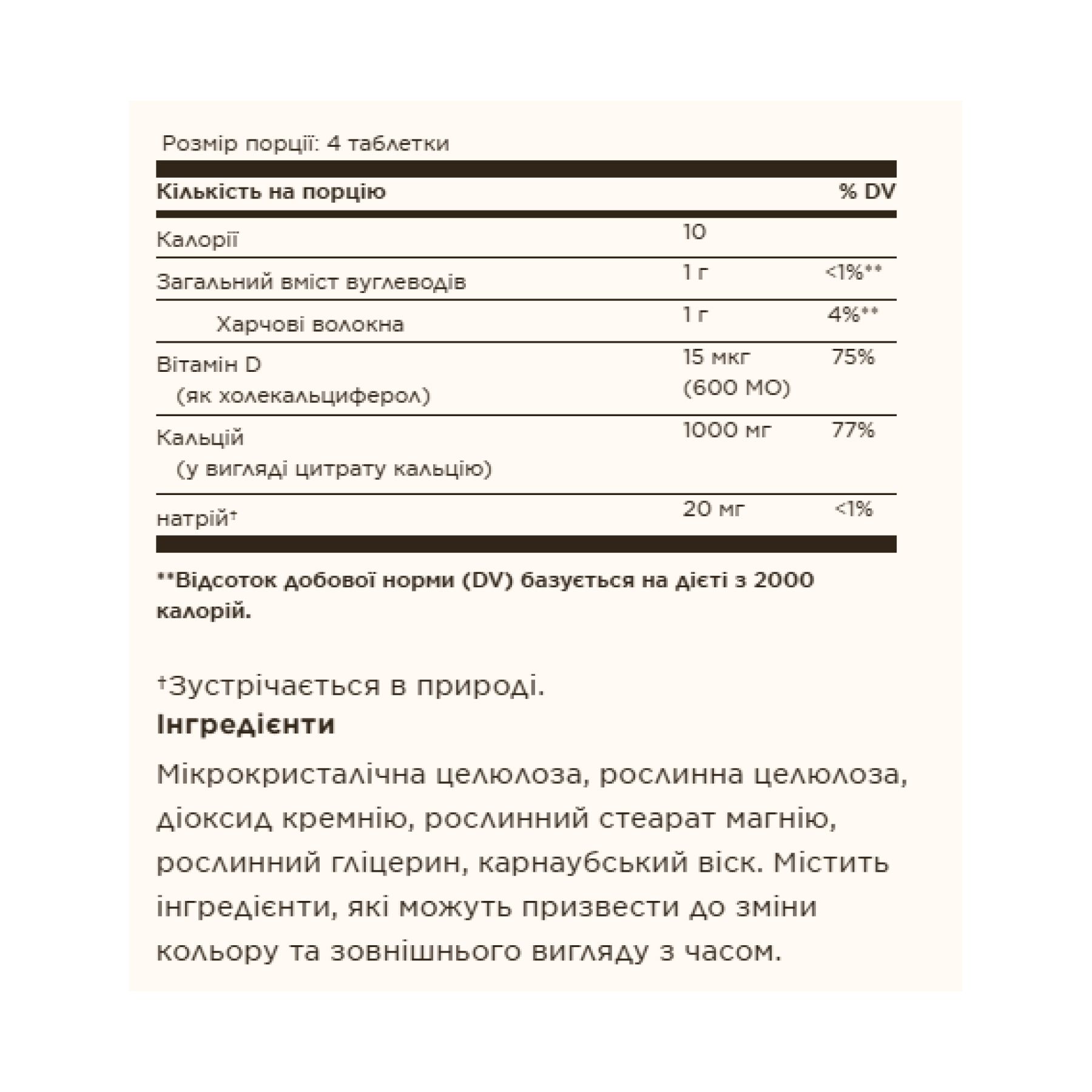 Кальцій є найважливішим мінералом, необхідним щодня для належного здоров’я. 99% кальцію в організмі можна знайти в кістках і зубах. Цей мінерал є будівельним матеріалом, який допомагає підтримувати міцність і здоров’я кісток і зубів. Крім того, кальцій допомагає підтримувати здоров’я інших систем організму, включаючи кістково-м’язову та нервову системи. Цей препарат містить вітамін D3, який сприяє засвоєнню кальцію.