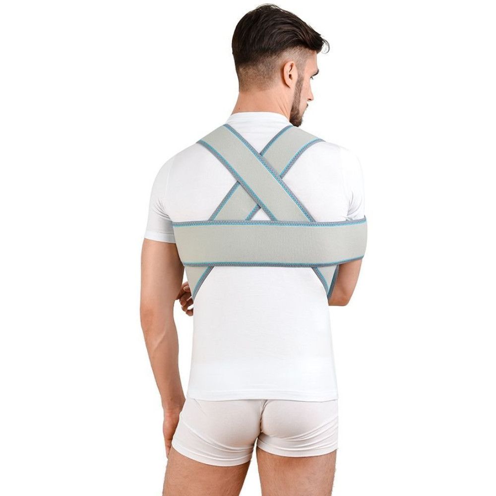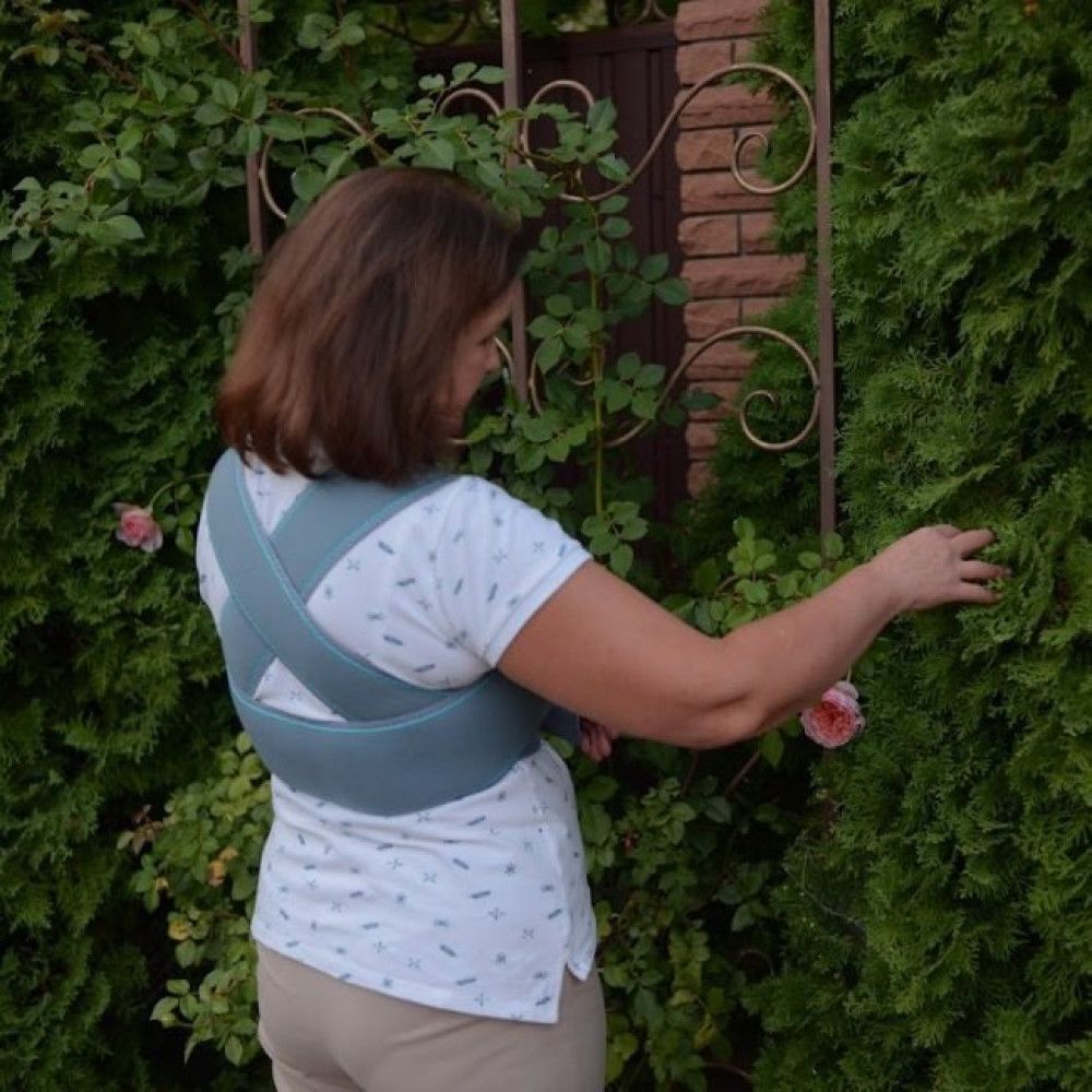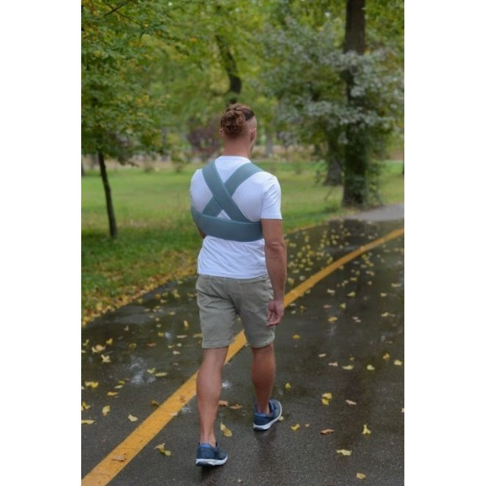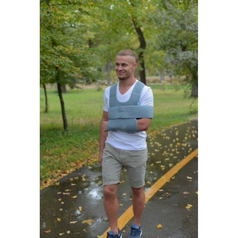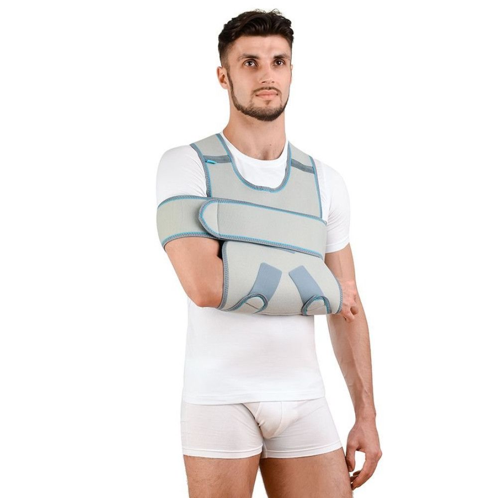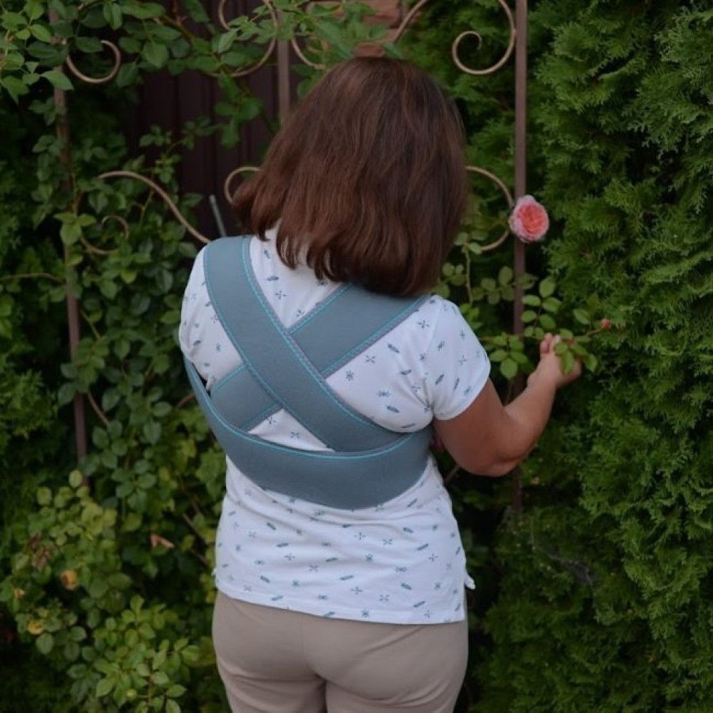 Положення опорної муфти для руки регулюється широкими ременями з якісними застібками-липучками. Ремені перехрещуються на спині, щоб зменшити можливість зміщення муфти. Вони достатньо широкі, не врізаються у шкіру й не створюють неприємних відчуттів у надпліччях. Додатковий ремінь фіксує кінцівку до тулуба, виключаючи будь-яке її зміщення. Уся конструкція має обробку країв трикотажем, щоб не натирати шкіру. Внутрішня поверхня бандажа вкрита бавовняною тканиною, яка чудово вбирає вологу й не викликає подразнень. Виріб одночасно надійний і комфортний. Бандаж універсальний: підходить і для правої, і для лівої руки.