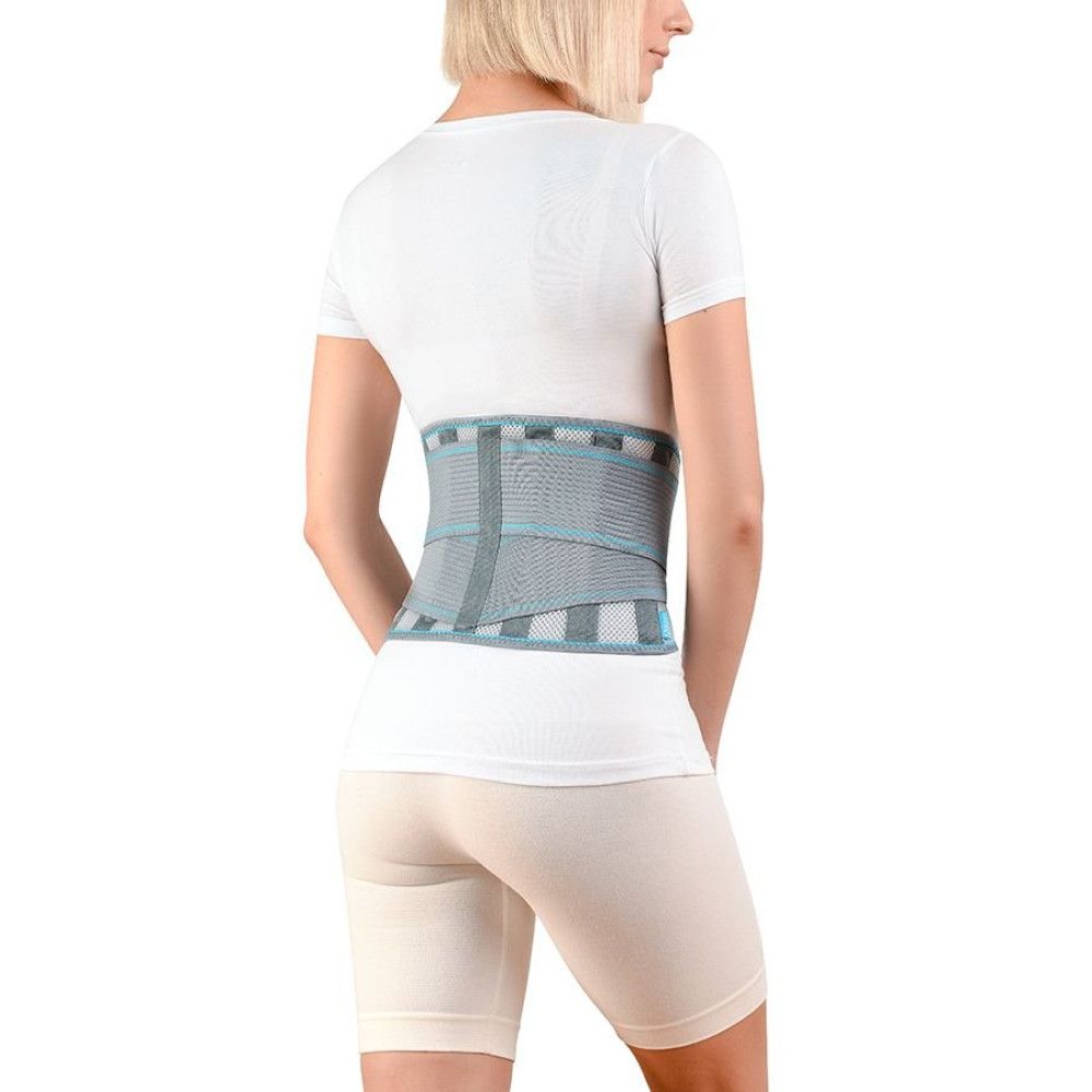 Бандаж на попереково-крижовий відділ хребта має 6 пластикових ребер жорсткості, які надійно підтримують спину, запобігаючи її травмуванню. Система подвійної фіксації попереду (застібки-липучки на полотні бандажа й додаткові еластичні фіксувальні стрічки з такими ж застібками-липучками) дозволяє зробити виріб максимально зручним. Усі матеріали надзвичайно зносостійкі, еластичні стрічки довго не втрачають своїх властивостей. Тканина спинки добре пропускає повітря й відводить вологу, залишаючи шкіру сухою.