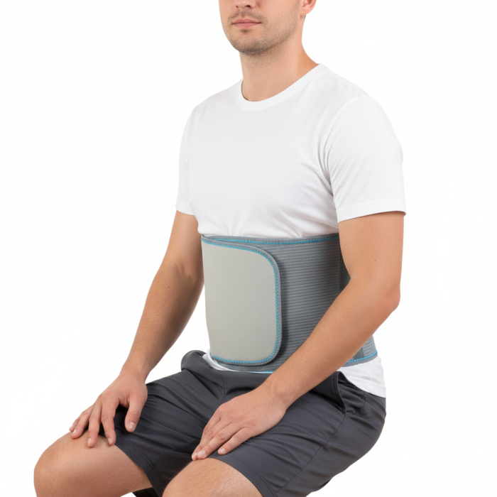 Бандаж виготовлений із високоякісної повітропроникної бандажної стрічки, яка тривалий час не втрачає своїх властивостей. Має бавовняний клапан, який м’яко захищає шов і не подразнює шкіру навколо нього. Еластичне полотно добре прилаштовується до параметрів фігури користувача, а липка стрічка дозволяє відрегулювати ступінь натягу бандажа. Ребра жорсткості запобігають скручуванню та зміщенню виробу. Тонкий, зручний і непомітний під одягом.