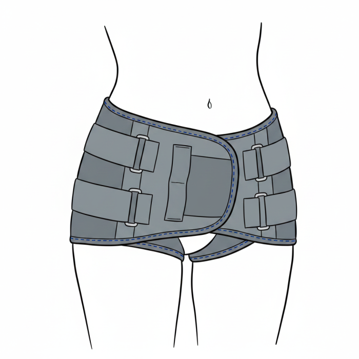 - Забезпечує сильний ступінь фіксації, знімає навантаження з поперека й тазового кільця.