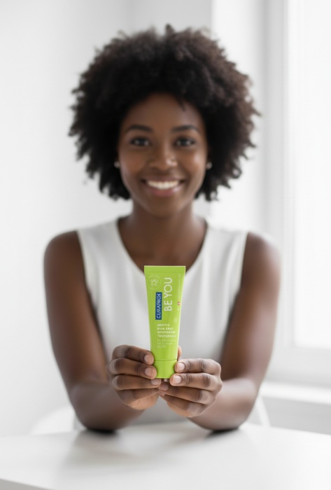 Curaprox Be You Green - освіжаюча зубна паста, яка поєднує соковите зелене яблуко, алое вера, м’яту та ментол. Завдяки ензиму глюкозооксидозі паста забезпечує м’яке природне відбілювання - перетворює цукор у безпечний перекис водню, який освітлює емаль без абразивів.
