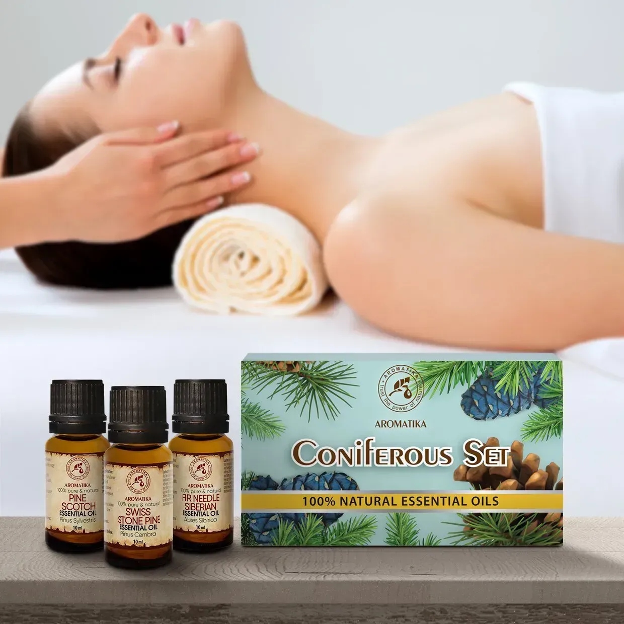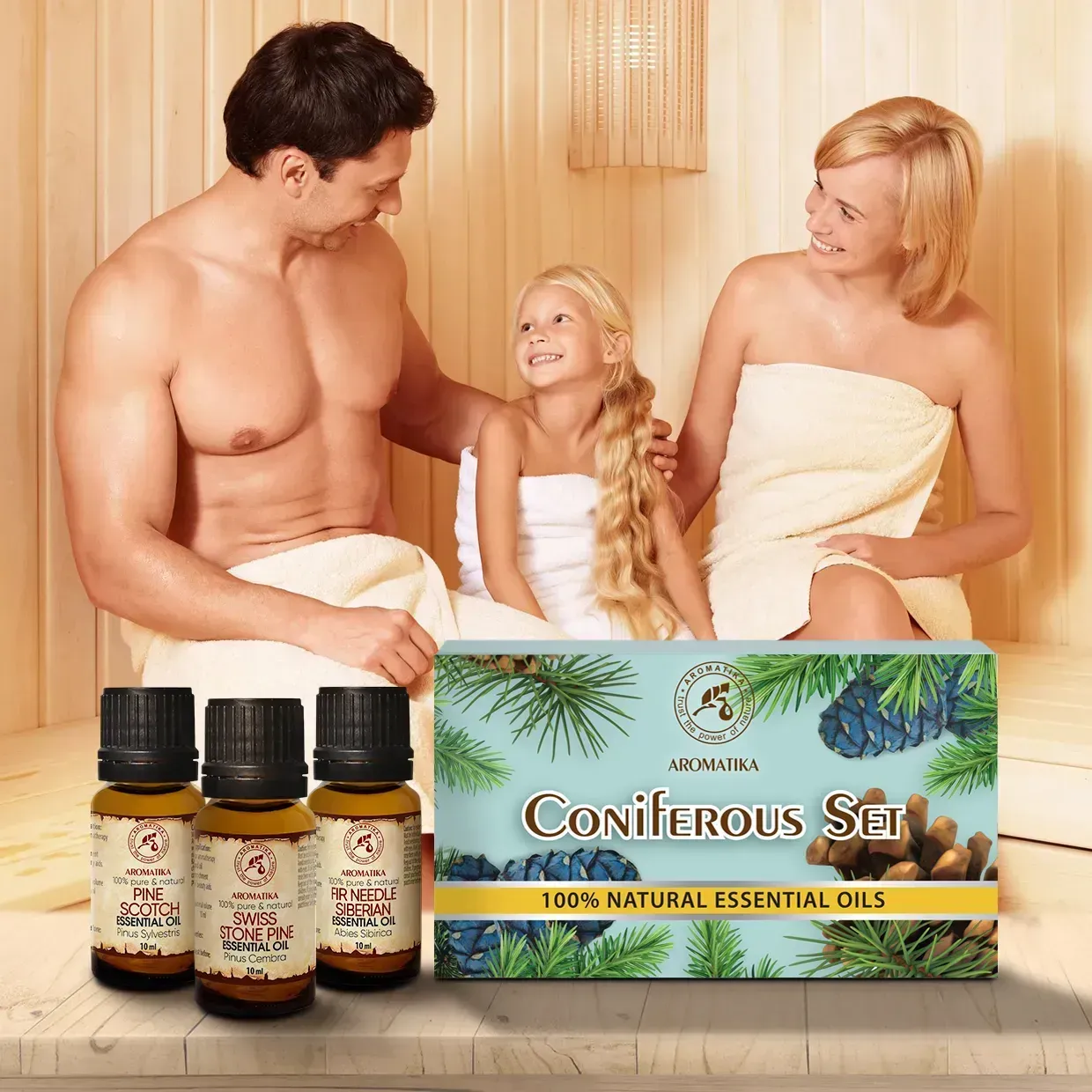 Хвойні ефірні олії також володіють яскраво вираженою бактерицидною, антисептичною, протизапальною, противірусною, відхаркувальною дією. Особливо корисні соснові та ялицеві ефірні олії в міжсезоння і холодну пору року для додаткового лікування або профілактики простудних захворювань. При вдиханні ефірні олії хвойних підсилюють роботу бронхів, а це покращує розрідження мокротиння та його вихід. Хвойні олії дуже часто використовуються в лазнях і саунах в якості натуральних ароматизаторів, як сильні антисептики вони вбивають практично всі відомі шкідливі мікроорганізми та підходять для оздоровлення шкіри. Засоби з набору також допомагають при хронічній втомі та стресі, тонізують, відновлюють душевну рівновагу і стимулюють розумову діяльність. Ефірні олії випускаються в яскравій і красивій коробці та можуть стати відмінним подарунком для Ваших рідних і близьких.