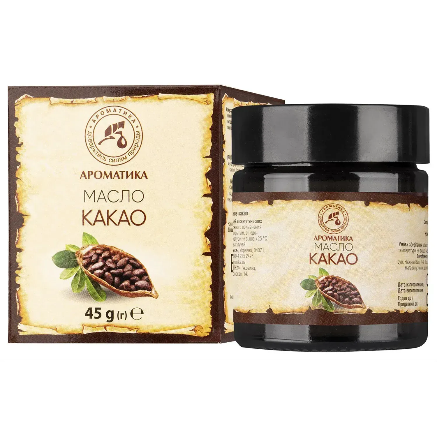 Масло какао Ароматика – це рослинне масло, отримане з насіння какао дерева. Це масло широко застосовується в косметології для захисту шкіри від шкідливого впливу навколишнього середовища та усунення невеликих косметичних дефектів. Масло какао, з природним вмістом білків, амінокислот і вітамінів, відмінно підходить для догляду за шкірою будь-якого типу. Цей засіб з приємним шоколадним ароматом захищає шкіру від передчасного старіння і додає шкірі обличчя і тіла пружність і еластичність. Баттер підходить для профілактики розтяжок шкіри на животі, стегнах, грудях вагітних жінок. Масло какао для тіла добре вбирається, не залишаючи на шкірі жирної плівки. Ви можете масло какао косметичне купити в нашому інтернет-магазині.