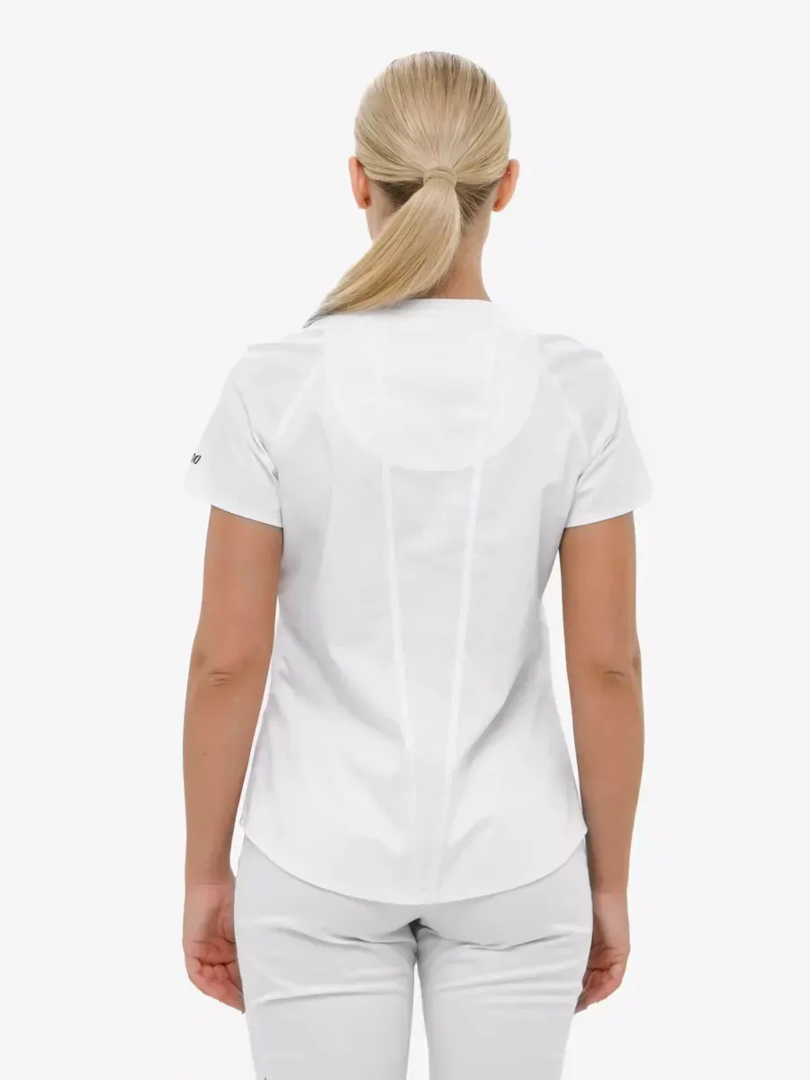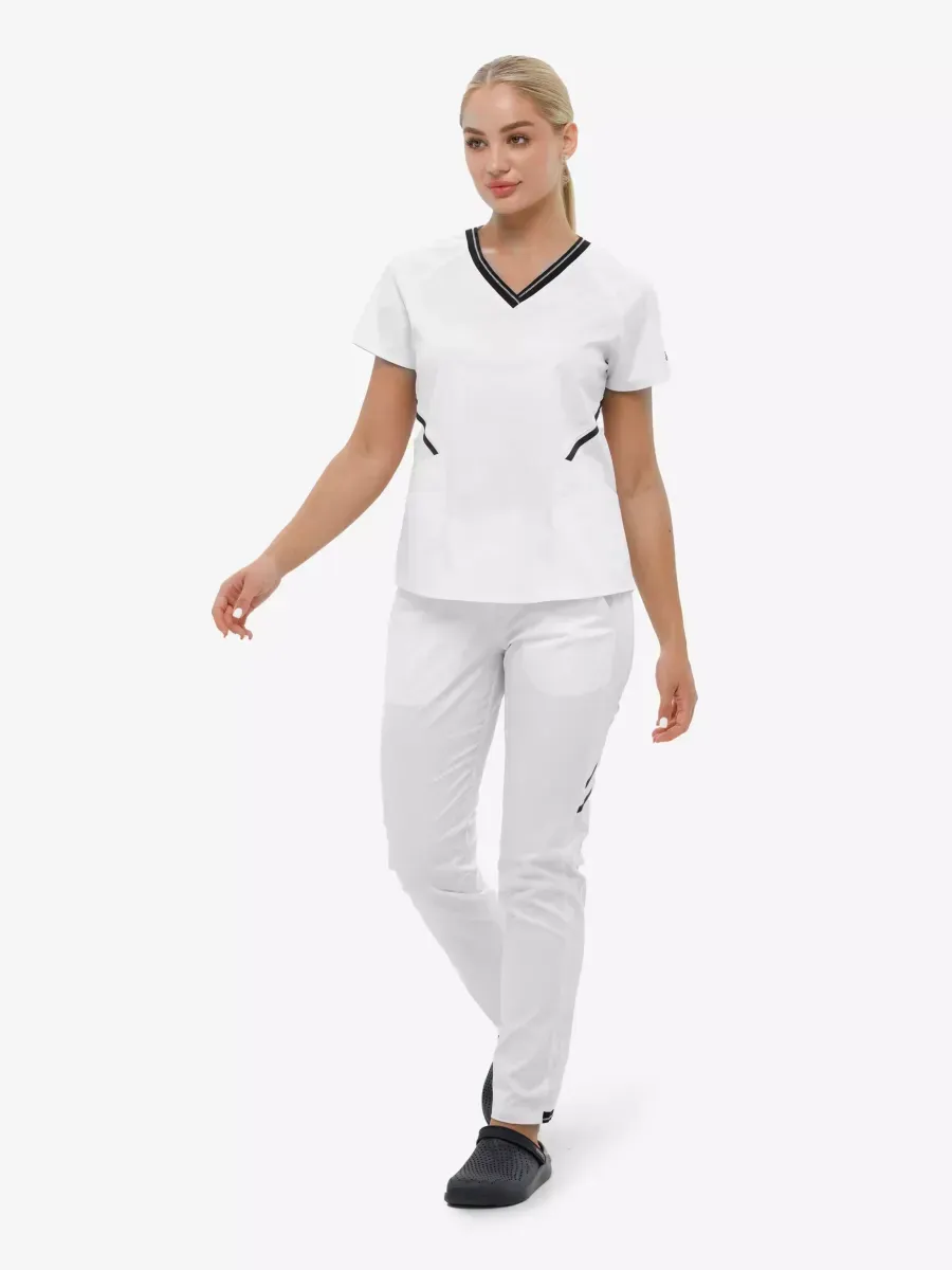 Ця модель вирізняється спортивним стилем, притаманним сучасному медичному одягу. Еластичний матеріал забезпечує повну свободу рухів, що є важливим для активної роботи в клініках чи лікарнях. Яскраві акценти на костюмі не лише підкреслюють унікальність дизайну, але й створюють позитивний настрій у робочому середовищі.
