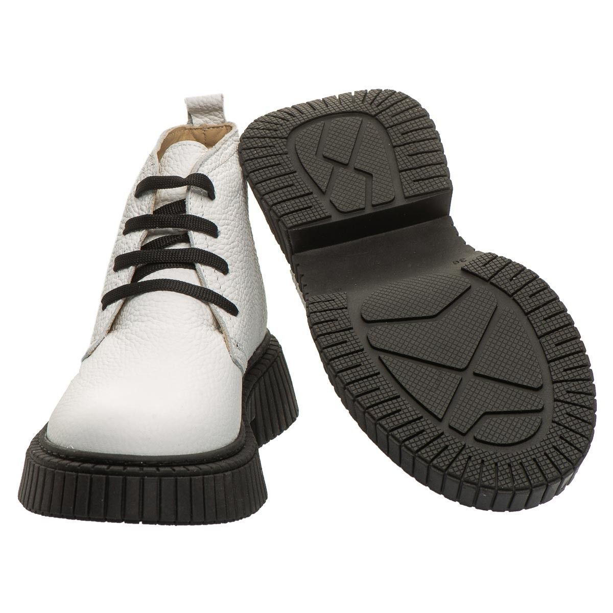 Theo Leo G325 SA WH надзвичайно стильна та актуальна модель черевик для юних модниць. Ефектні дитячі демісезонні черевики для дівчинки пошиті з натуральної шкіри білого кольору з високою рифленою чорною підошвою. Створені для комфортних буднів та приємних осінніх прогулянок. Всередині черевики утеплені флісом, мають шкіряну устілку. Головними комфортними елементами моделі є твердий задник, анатомічно правильна устілка з подушечкою під зведення стопи. Застібка - шнурівка дозволяє відрегулювати повноту ніжки та забезпечить її надійну фіксацію, та додає ефектного вигляду своїм чорним кольором.