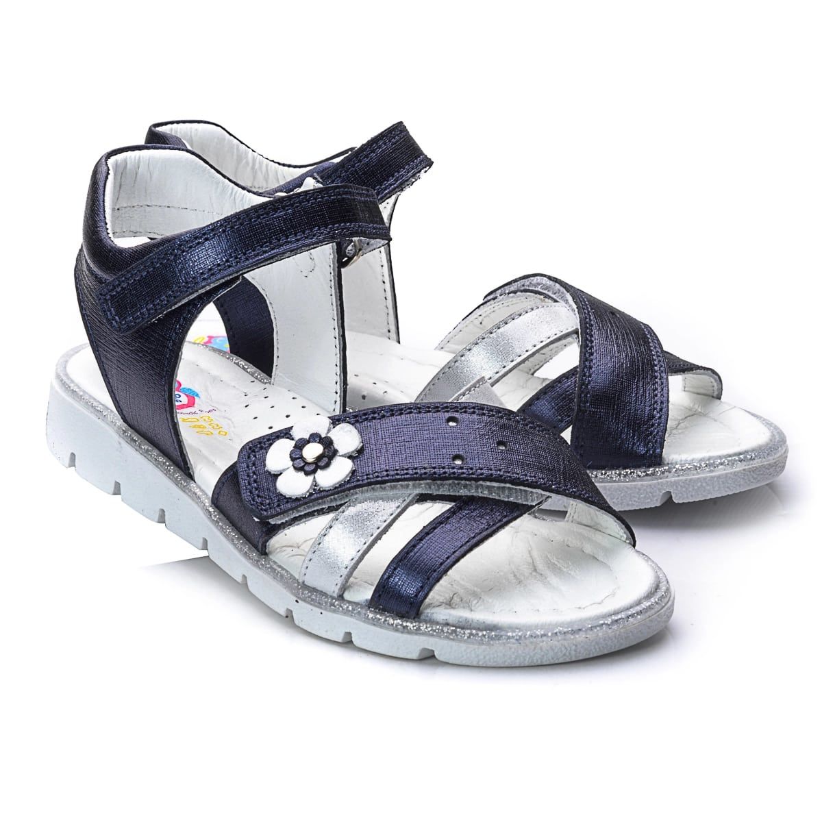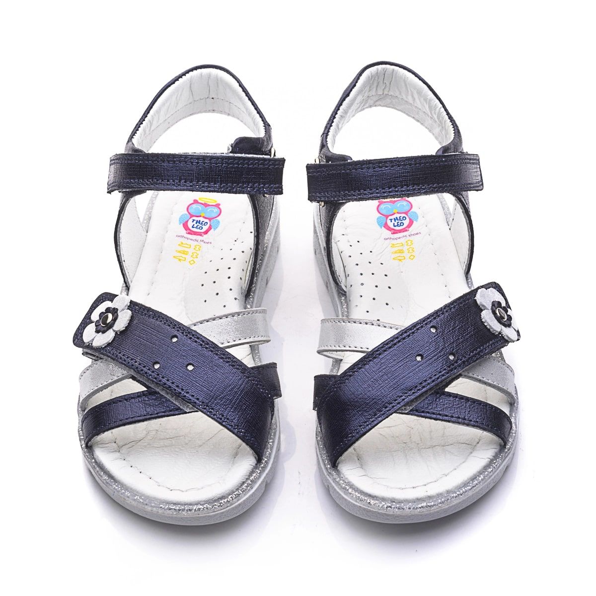 THEO LEO 732 елегантні дитячі сандалі виконані з високоякісної шкіри темно-синьо кольору з сатиновим ефектом, прикрашені смужкою з сріблястою шкіри і сріблястою квіточкою. За допомогою двох надійних застібок-липучок можна відрегулювати повноту ніжки, надійно фіксувати взуття на нозі та легко знімати, фіксуються на щиколотці за допомогою липучки. Зручна устілка з анатомічним супінатором забезпечує максимальний комфорт для кожного кроку. Вони ідеально підійдуть для літніх прогулянок, святкових заходів та в повсякденному житті.