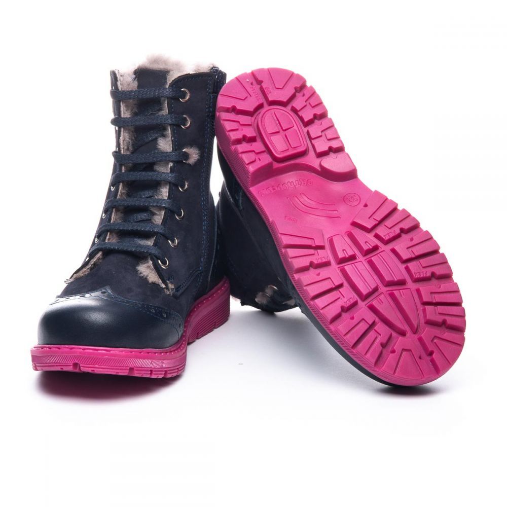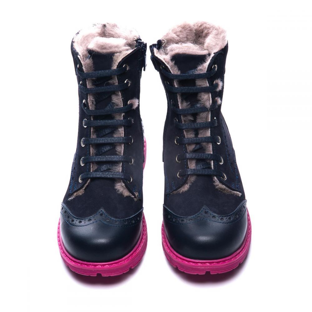 Theo Leo 1070 - яскраві зимові черевики з натуральної шкіри і нубука темно синього кольору. Взуття на блискавки, на модній підошві рожевого кольору. Модель декорована стильною перфорацією. Всередині - натуральне хутро. У взутті супінатор, каблук Томаса і анатомічна устілка. Підошва - термопластіковая гума, не ковзає і добре амортизує.