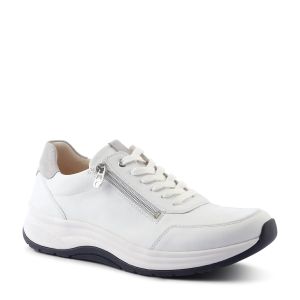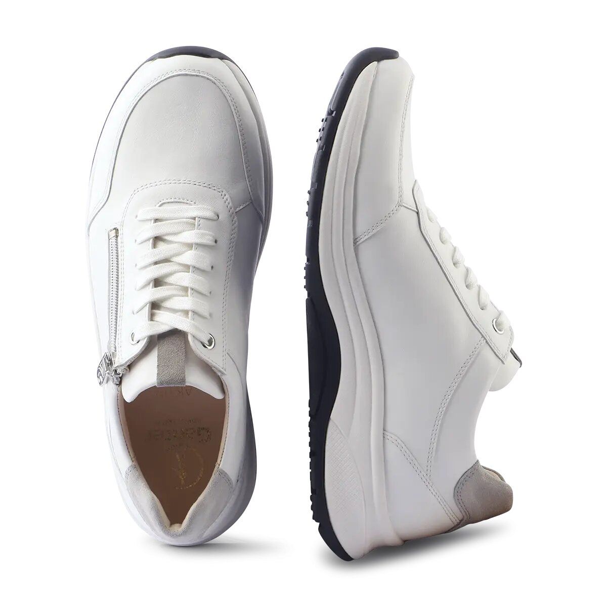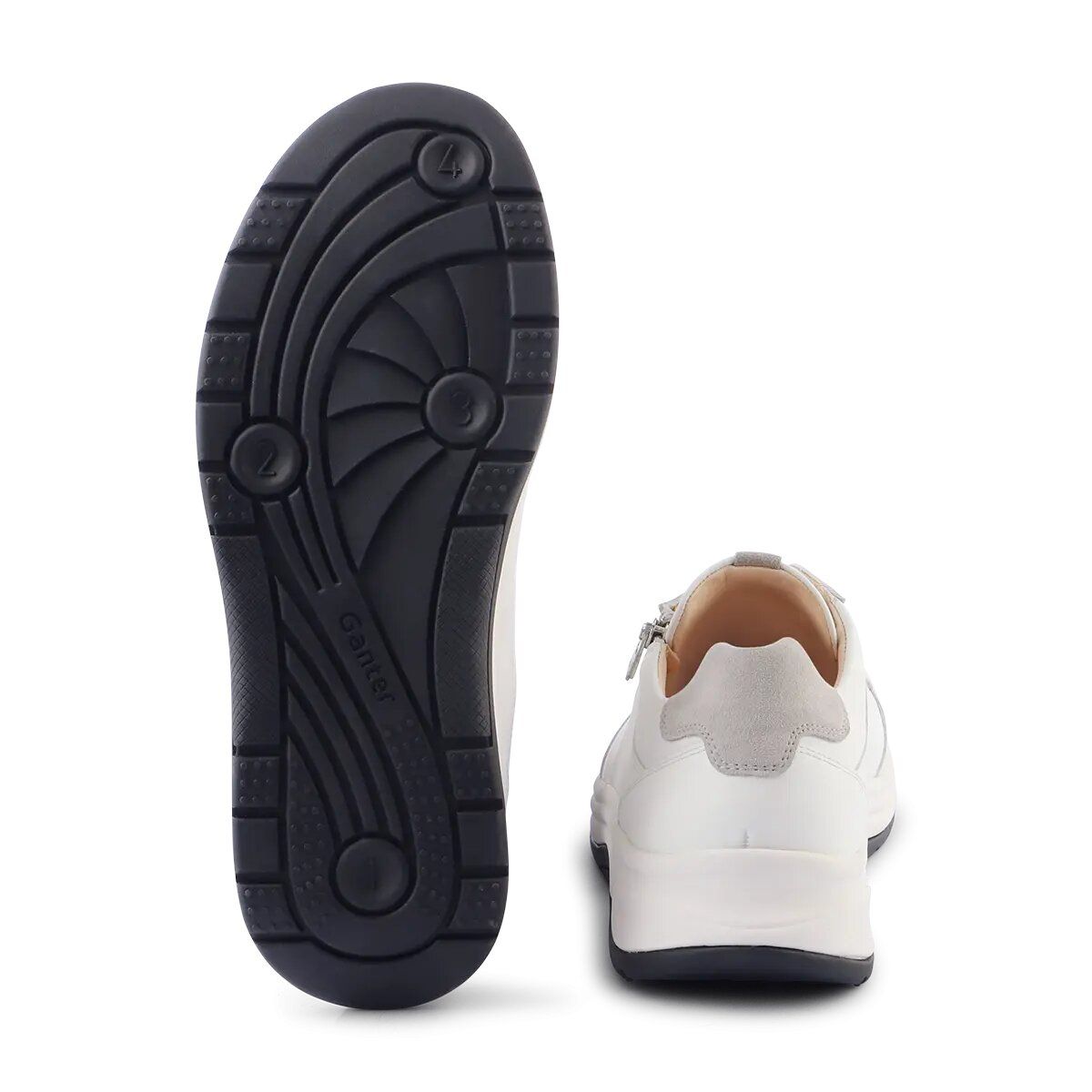 Запатентована технологія кочення підтримує кожен крок, а м'яка шкіра наппа сучасного білого кольору забезпечує повсякденний вигляд. Продумані деталі декору, такі як на п'яті, доповнюють дизайн. Бічна блискавка додає візуального акценту та робить взування кросівок з тонкою шкіряною підкладкою легким. Підошва з 4-точковим перекатом відчувається на нозі легко і м'яко, покращує поставу і знімає навантаження зі спини і суглобів. Під час носіння ви відчуєте активуючий масажний ефект, що дасть вам змогу робити довші прогулянки легко та з комфортом. Концепція AKTIV може не тільки полегшити та запобігти болю в опорно-руховому апараті, але й зменшити стрес. Спробуйте та зробіть крок у майбутнє з GANTER AKTIV!