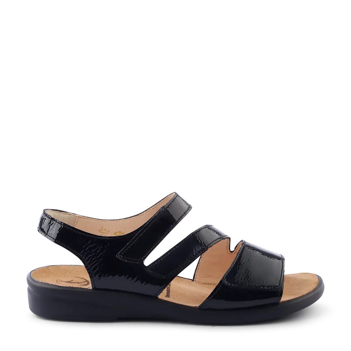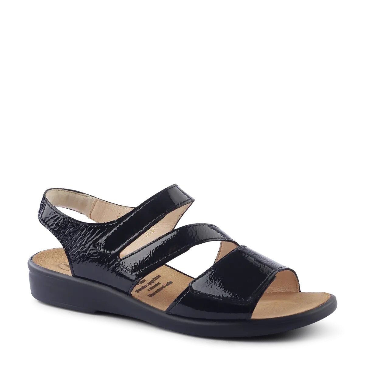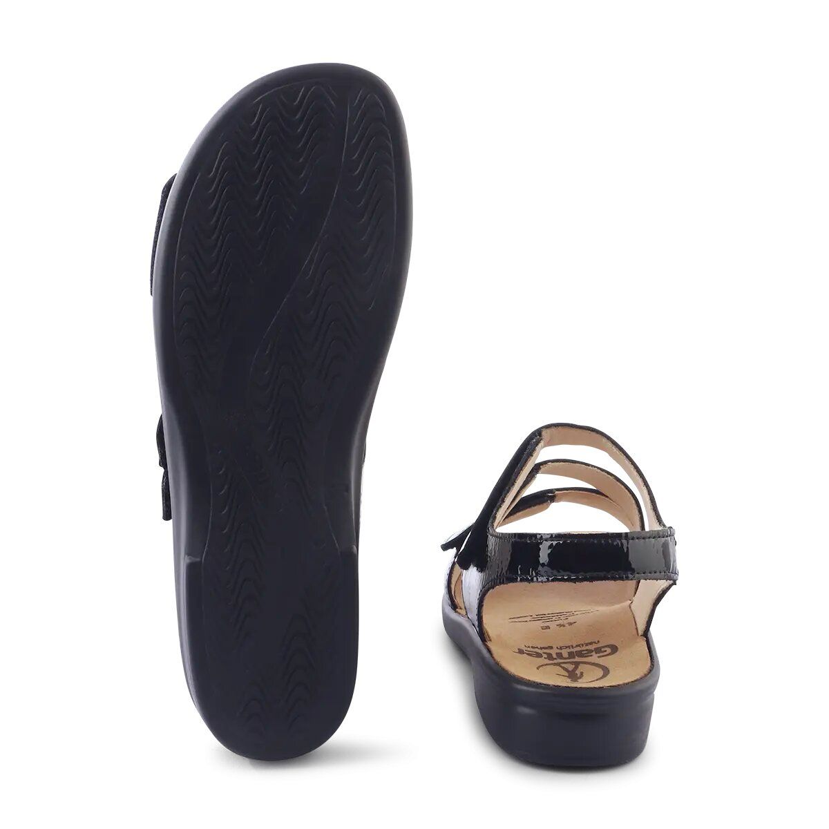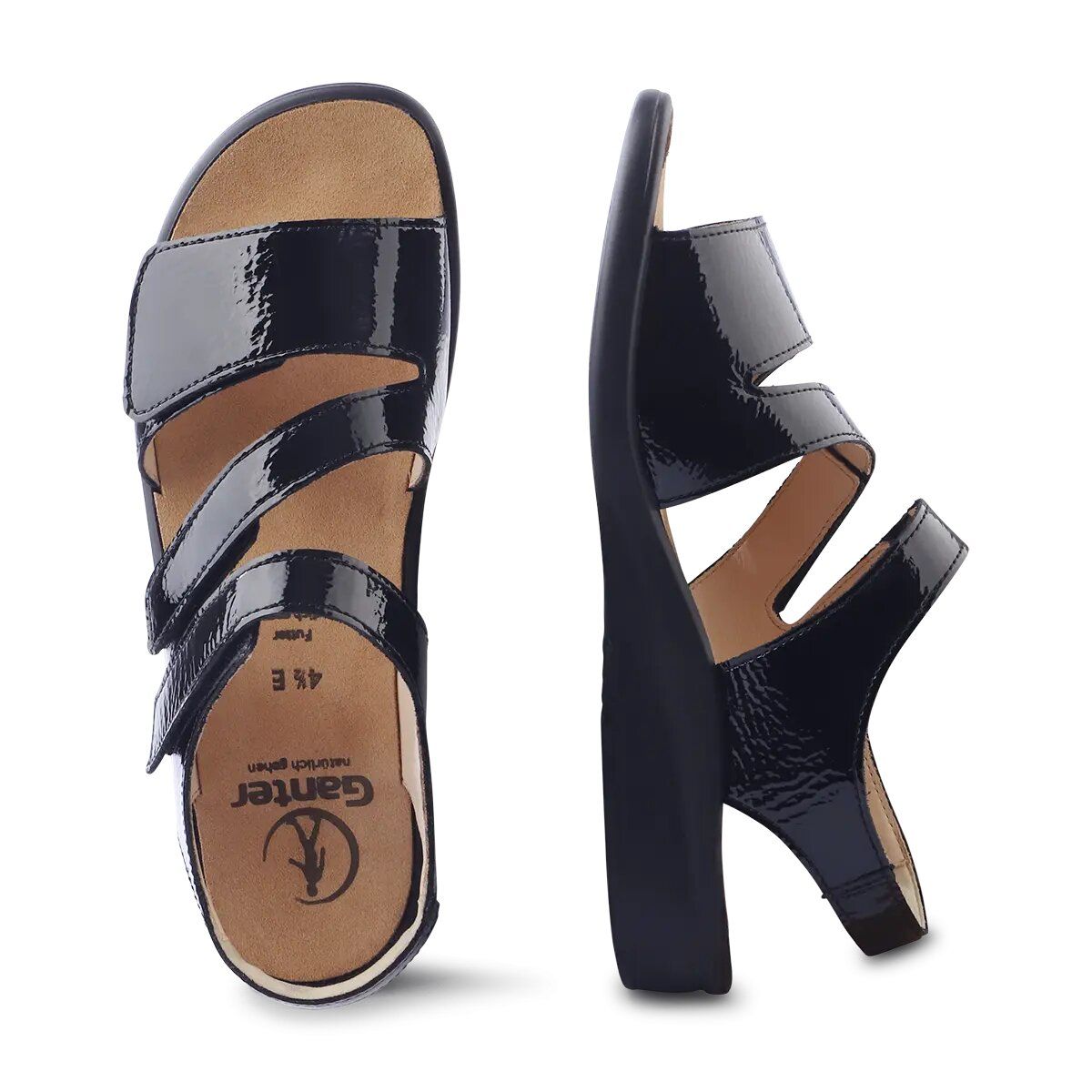 Ортопедичні сандалі GANTER Sonnika поєднують елегантну простоту дизайну та продуманий комфорт для щоденного носіння. Модель створена у ширині E, що забезпечує ідеальну посадку та підтримку для вузької стопи. Верх виконаний із блискучої чорної лакової шкіри, яка надає взуттю стильного та сучасного вигляду. Три зручно розташовані ремінці на липучках разом із додатковим ремінцем на п’яті дозволяють легко та точно відрегулювати посадку відповідно до індивідуальної форми стопи.