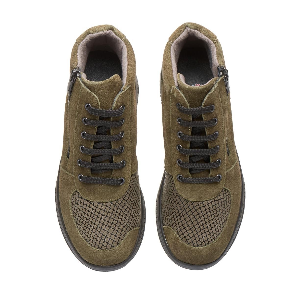 Зручне демісезонне взуття виготовлене з натуральної замшевої шкіри, кольору хакі, забезпечує максимальну зручність, допоможе при профілактиці та лікуванні плоскостопості будь якого типу чи вальгусної деформації. Взуття створене для широкої стопи ноги, з використанням інноваційних матеріалів, надлегке, зменшує тиск на суглоб великого пальця стопи, сприяючи комфорту та мобільності.
