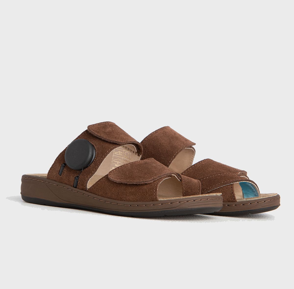 Відкрийте для себе перше взуття, яке дійсно допомагає при вальгусній деформації стопи. Лікувальні терапевтичні шльопанці 4050 Hallufix® коричневого колору.