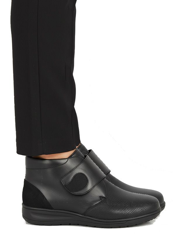 Жіночі черевики Solidus Kate чорного кольору з сріблястим покриттям, з підтримкою склепінь стопи для профілактики плоскостопості та деформацій стоп. Виготовлені з високоякісної шкіри, ці чоботи відрізняються довговічністю та розкішним виглядом. Шкіра плавно прилягає до стопи, забезпечуючи тривалий комфорт. Еластичний матеріал по всій площі передньої частини стопи забезпечує максимальний комфорт, оскільки немає дратівливих швів, які можуть тиснути. Широка застібка-липучка легко регулюється, забезпечує хорошу підтримку та значно полегшує взування та знімання взуття. Поєднання матеріалів також робить взуття візуально привабливим. Черевики Solidus Kate – ідеальне рішення для демісезонного періоду. Стильний дизайн із текстурною вставкою робить цю модель справжнім хітом осінньої колекції.