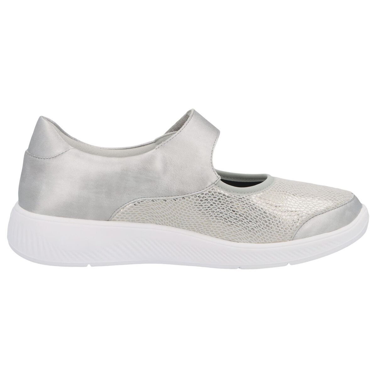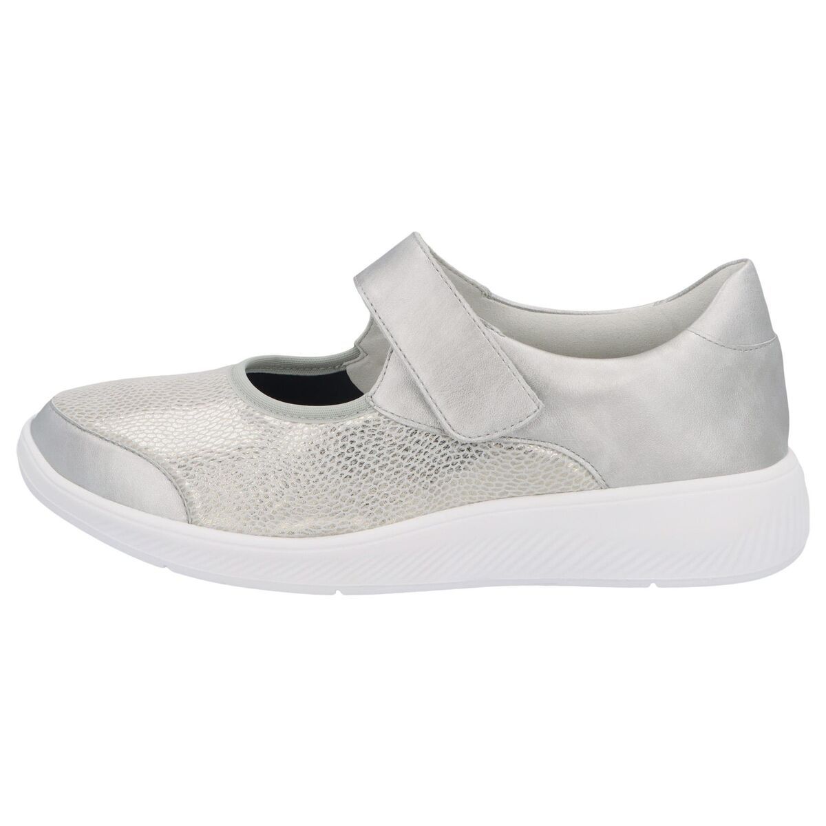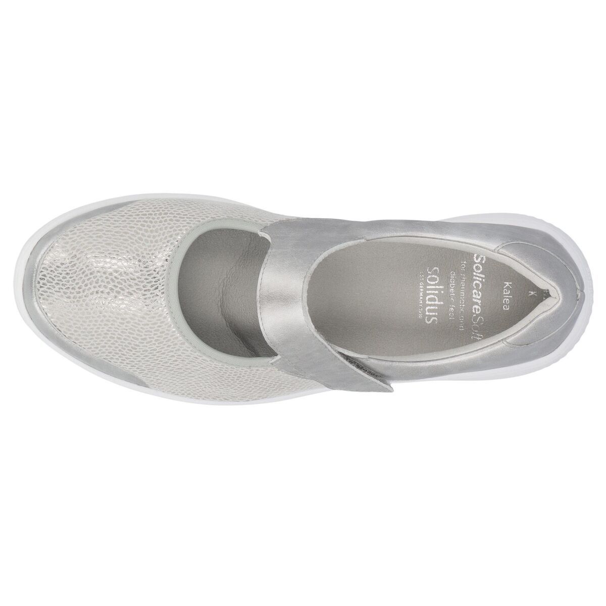 Solidus Kalea з лінійки SolicareSoft – це туфлі на ремінці з сірої металевої шкіри з широкою регульованою застібкою-липучкою. Мають гнучку підошву з легким коченням та великою контактною поверхнею. Разом це створює плавну ходу з прямим коченням, яка не потребує роздумів, дозволяючи вам повною мірою насолоджуватися міським середовищем та пішохідними прогулянками. Kalea оснащена технологією амортизуючої підошви Solidus 3D для додаткової амортизації. Подовжена підошва забезпечує хорошу стійкість п'яти. Сірий нубук з неопреном (стрейч) для чутливих та вразливих ніг. Підкладка повністю шкіряна та підтримує комфортний клімат для ніг.
