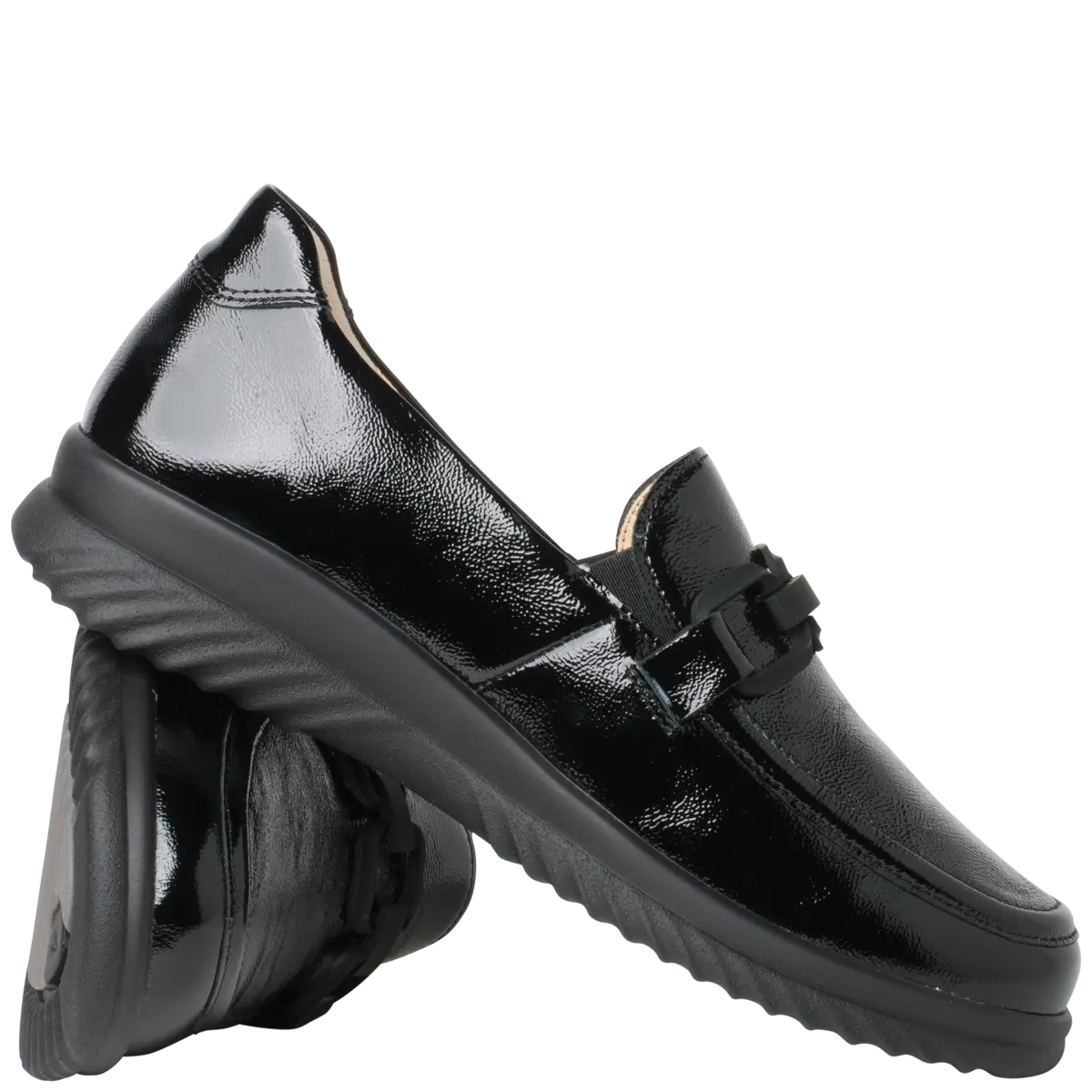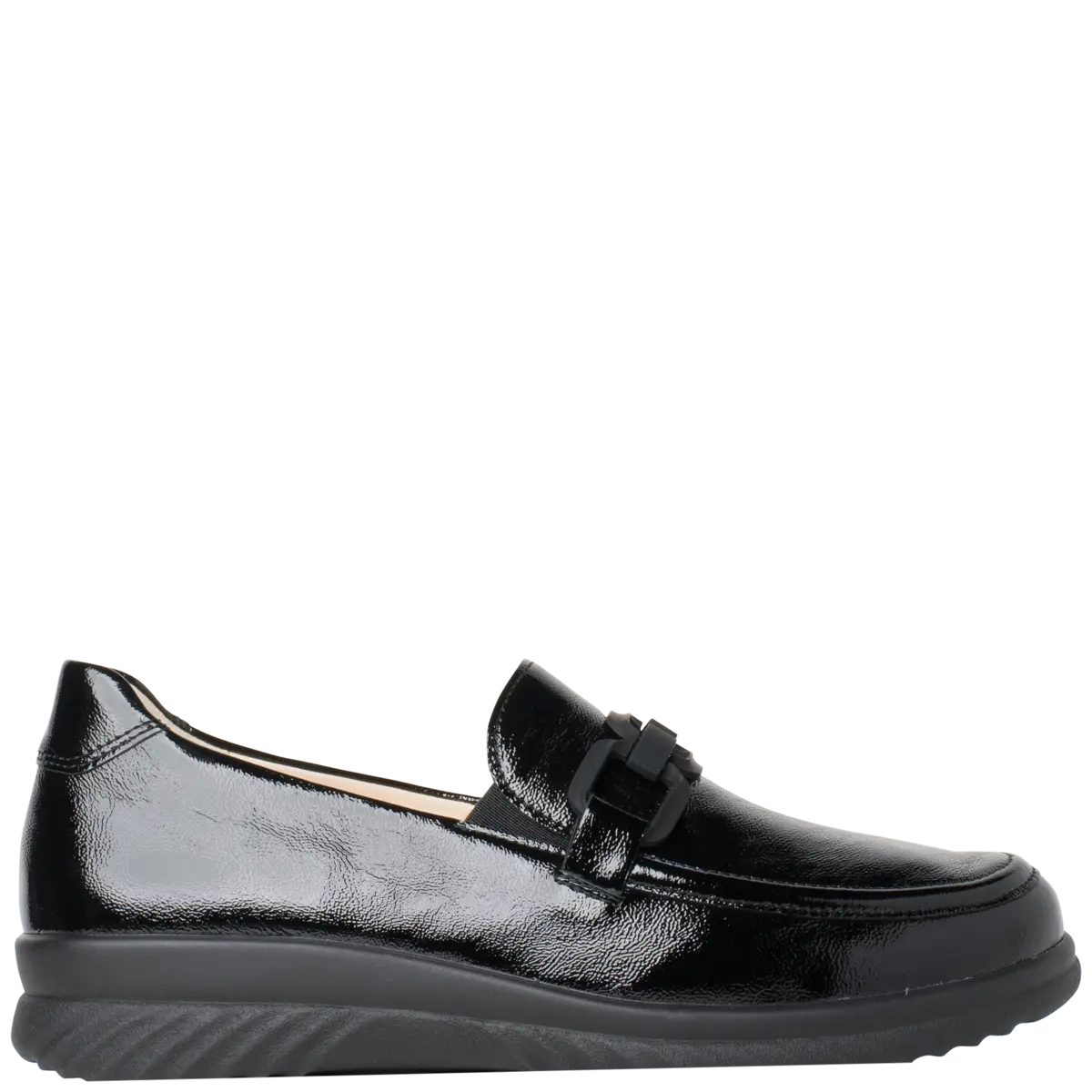 Ортопедичні жіночі туфлі Heike від Ganter елегантний компаньйон із сучасної лакованої шкіри. Зручна універсальна модель, що привертає увагу в класичному чорному кольорі. Стримані прикраси в тон моделі підкреслюють елегантний вигляд, тоді як форма виглядає спортивною, простий витончений дизайн робить лофери незамінним фаворитом для багатьох випадків. Ширина H згладжує широку стопу, а вузька п’ята забезпечує необхідну підтримку, щоб можна було без проблем долати довші відстані пішки. Завдяки висоті каблука 25 мм підтримується опорно-руховий апарат, і в той самий час ви отримуєте користь від невеликої додаткової висоти. Внутрішня підкладка виготовлена з маслянистої м'якої шкіри, яка володіє багатьма позитивними властивостями. Матеріал дихаючий, міцний і приємний до шкіри.