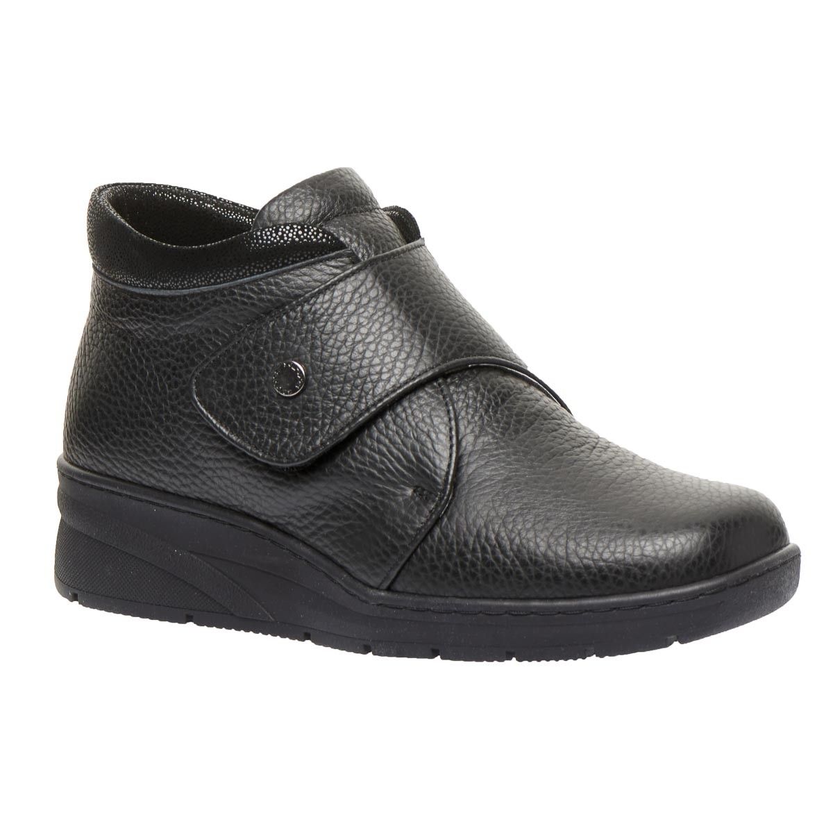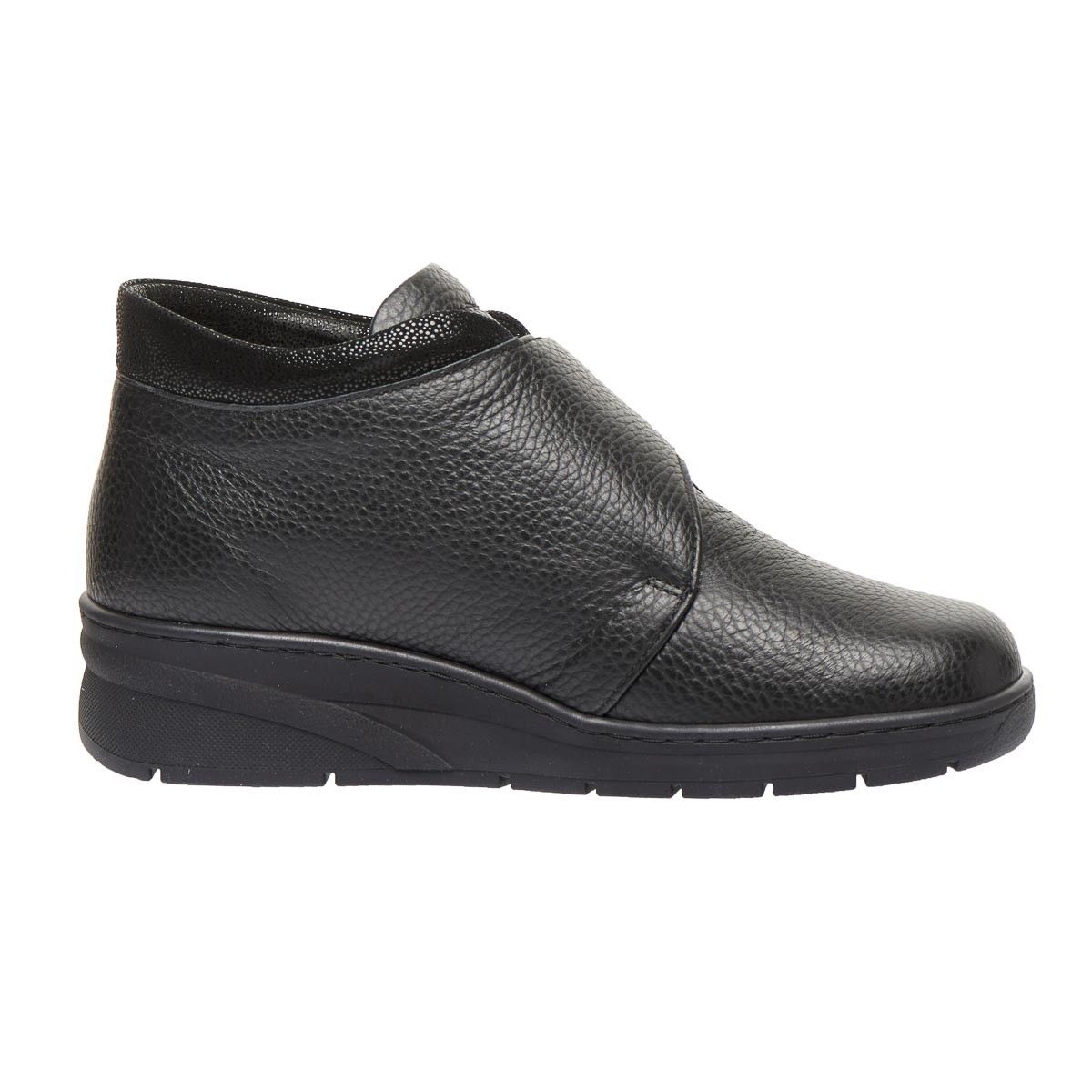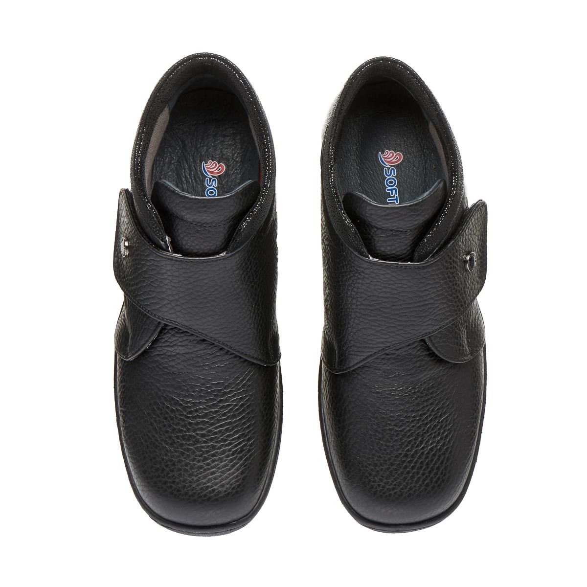 Зручне демісезонне взуття виготовлене з натуральної шкіри, чорного кольору, з декорованою манжетою та застібкою на липучці забезпечує максимальну зручність, допоможе при профілактиці та лікуванні плоскостопості будь якого типу чи вальгусної деформації. Взуття створене для широкої стопи ноги, з використанням інноваційних матеріалів, надлегке, зменшує тиск на суглоб великого пальця стопи, сприяючи комфорту та мобільності.