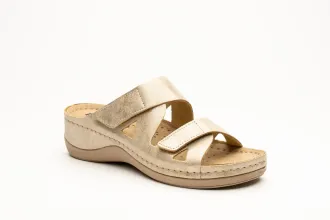 Жіночі шльопанці Leon Золотий 906-Золотистий-блиск ортопедія. Характеристики: Артикул: 906 Золотистий блиск, Колір: Золотий, Матеріал верху: Натуральна шкіра, Вид підкладки: Масажний гель / меморі-піна, Матеріал підошви: поліуретан і протектор проти ковзання, Країна виробник: Сербія.