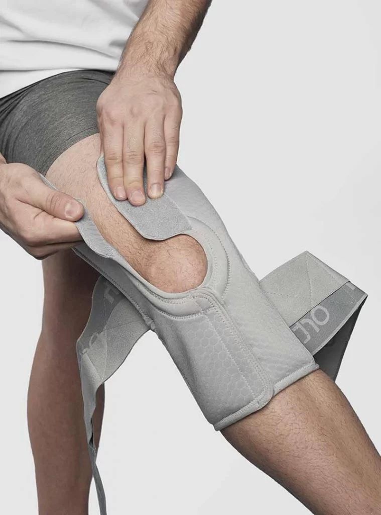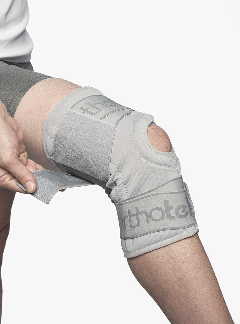 1. Покладіть на коліно наколінник Standard plus так, щоб м'яке кільце щільно обернулося навколо колінної чашки. Використовуючи елементи липучки, стягніть конструкцію і зафіксуйте її на місці, спочатку прив'язавши елемент над колінною чашкою, а потім елемент під нею. Переконайтеся, що кільце точно відцентроване на колінній філіжанці і надійно закріплене і Вам зручно.