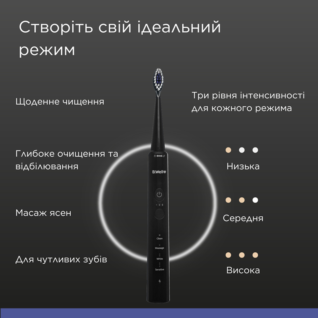 Електрична зубна щітка B.Well підійде кожному користувачу, завдяки індивідуальному налаштуванню та вибору режима. Звукова зубна щітка MED-870 безпечна для пломб, мостів, імплантів, коронок і брекетів.