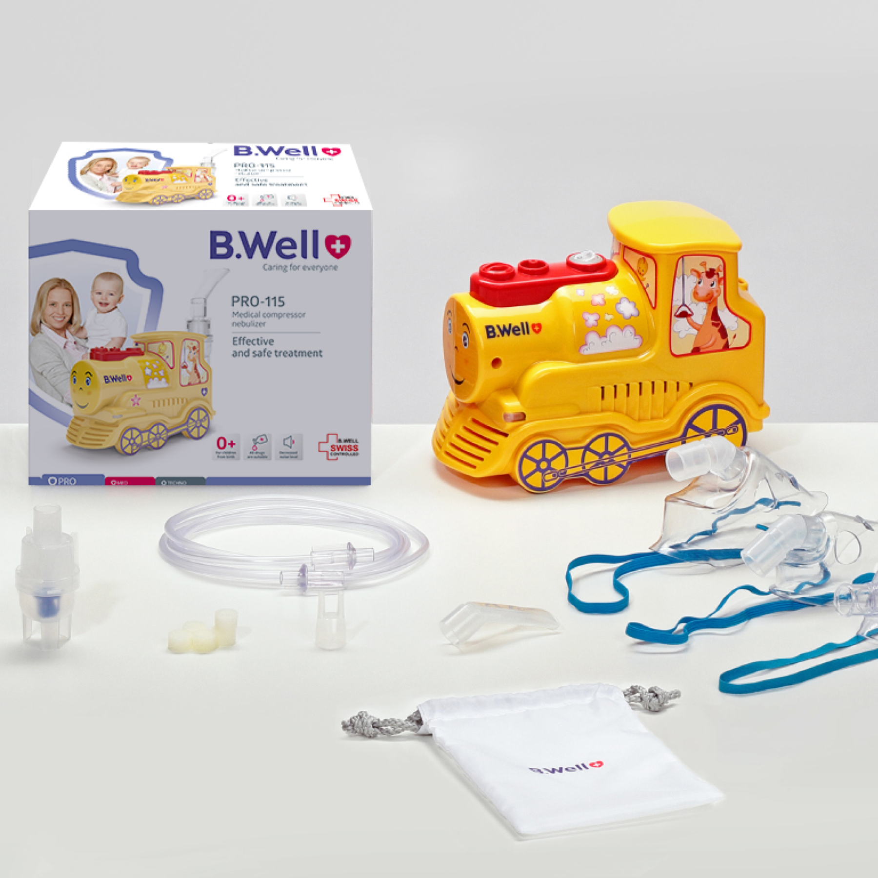 Небулайзер є різновидом інгалятора, який використовують у разі захворювання нижніх та верхніх дихальних шляхів. У комплект PRO-115 входять не тільки мундштук та маски для дітей та дорослих, але й насадка для носа, яка дозволяє використовувати небулайзер при нежиті.