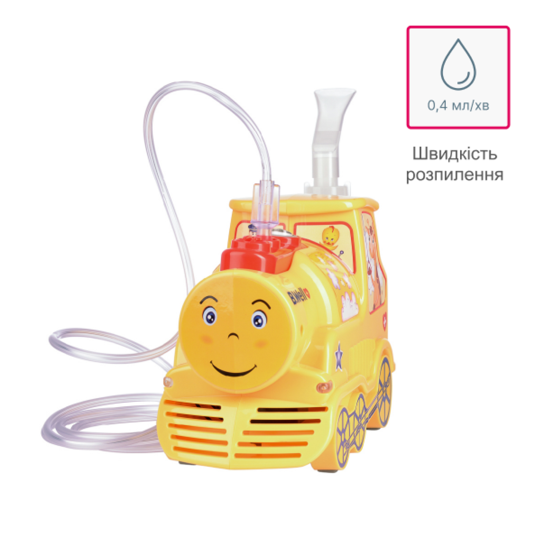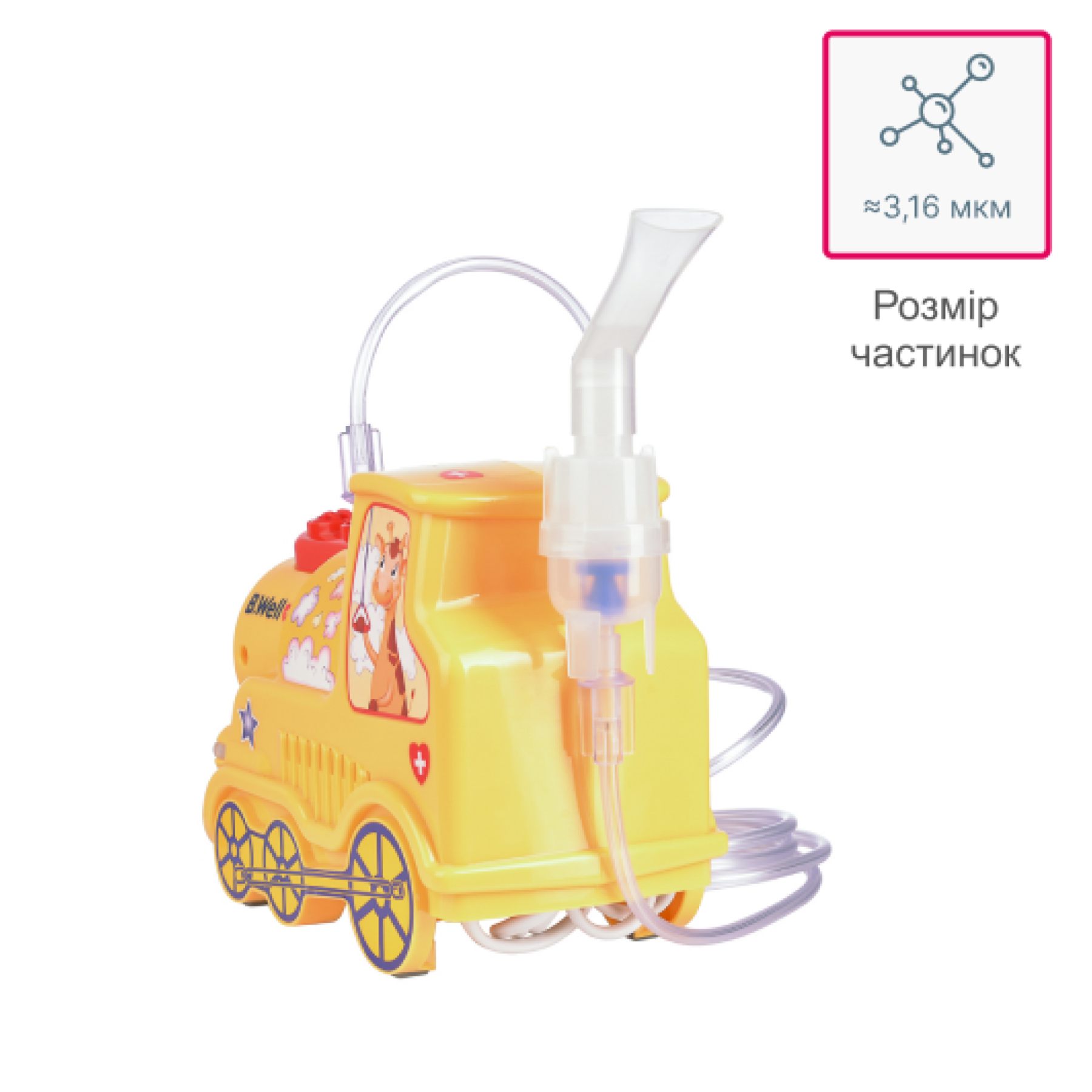 Розмір частинок Розмір частинок ≈3,16 мкм дозволяє лікам глибоко проникнути в потрібний відділ легень для швидкого одужання. Підходить для дітей та дорослих Надійний компресор нового покоління, дитячий дизайн, знижений рівень шуму роблять цей пристрій зручним для всієї родини. Швидкість розпилення Висока швидкість розпилення 0,4 мл/хв скорочує час процедури. Показання до застосування