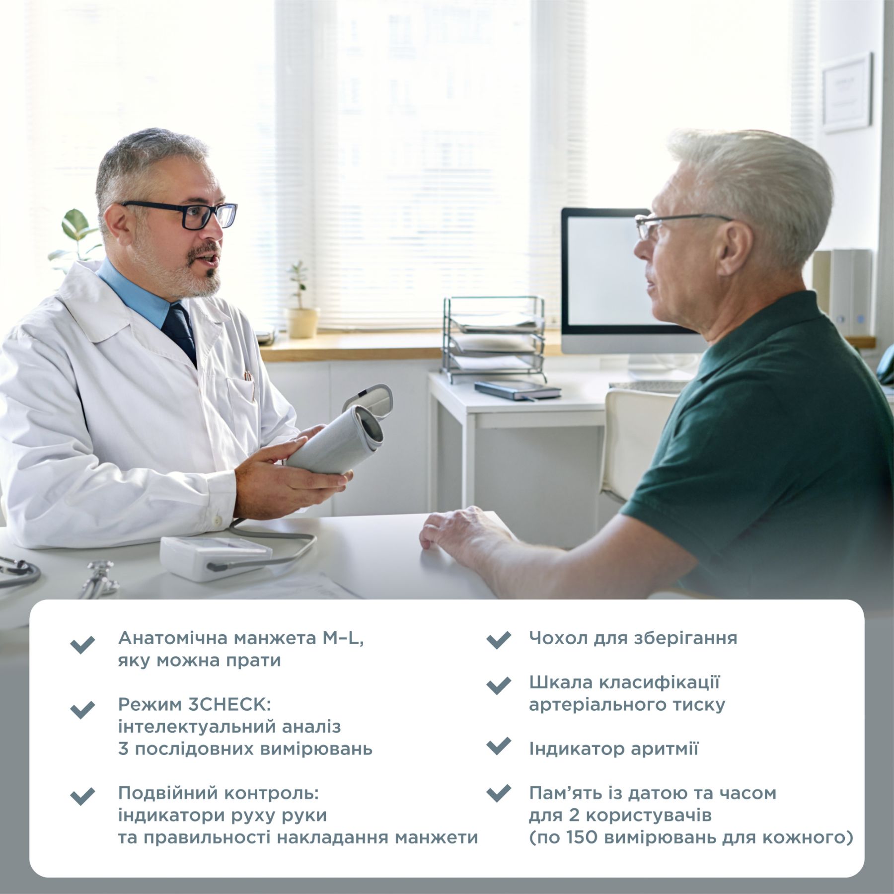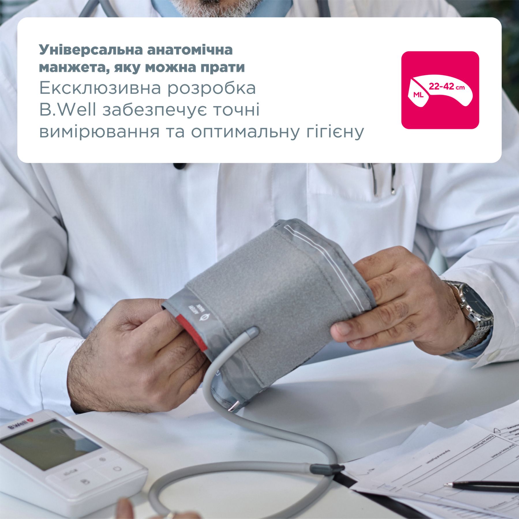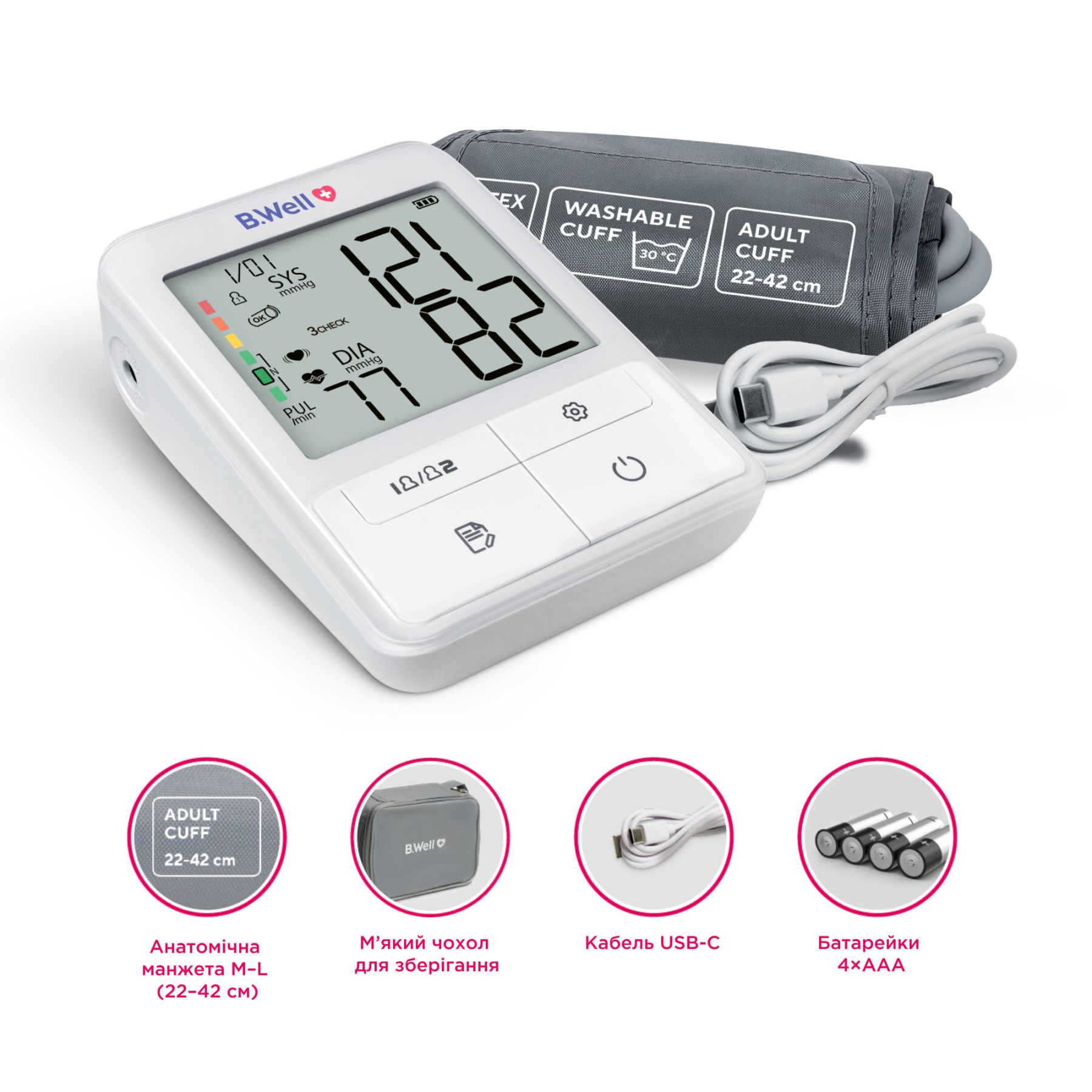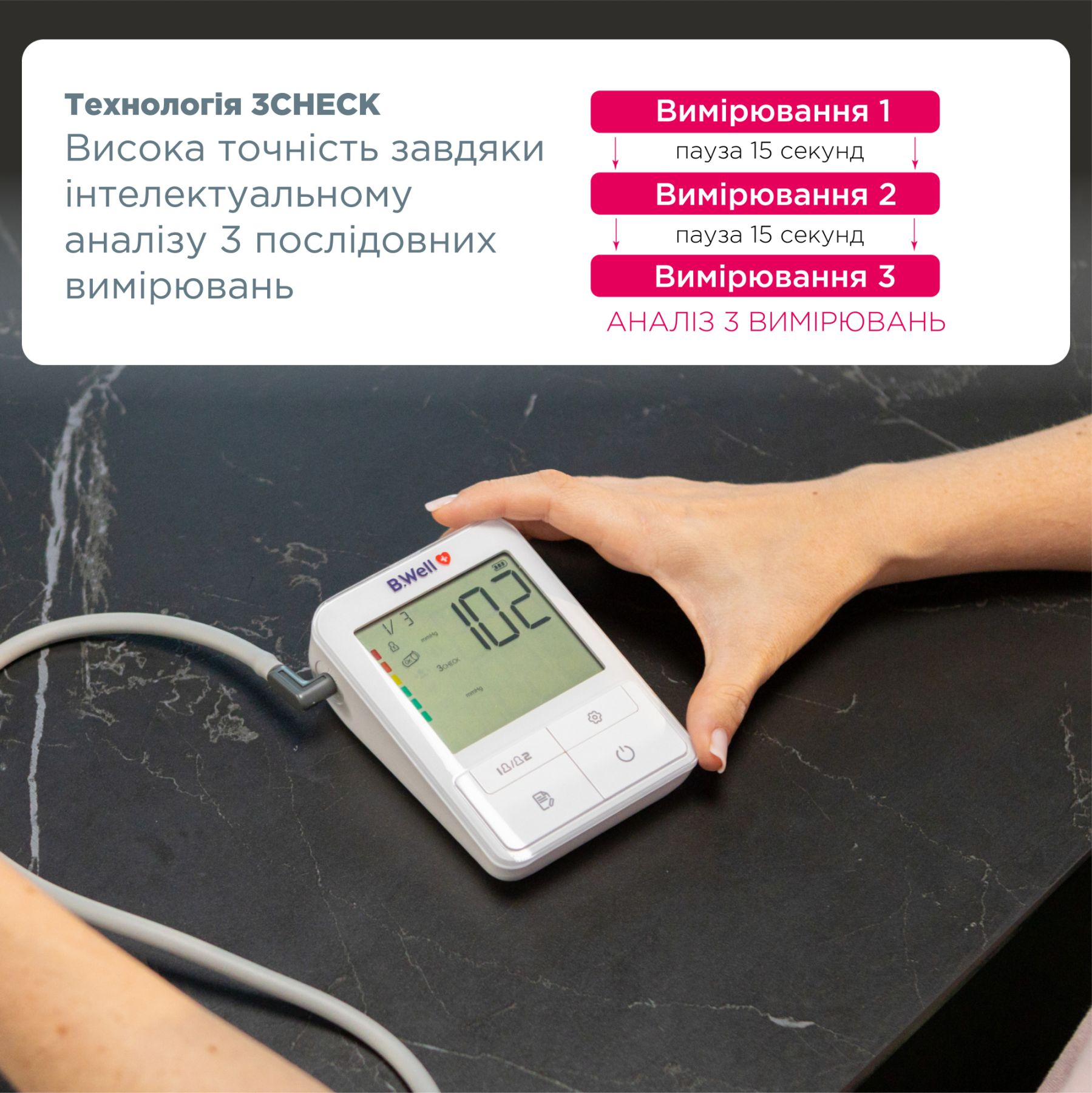 Технологія 3Check Тонометр робить 3 послідовних вимірювання з інтервалом в 15 секунд. Потім виріб проводить аналіз вимірювань, за спеціальним алгоритмом та виводить максимально точний результат. Пам’ять на 2 користувача Об’єм пам’яті дозволяє зберігати до 150 вимірювань для кожного окремо. Дані зберігаються з датою та часом, що дає змогу аналізувати стан здоров’я у зручний час. Зручність у використанні Прилад оснащений великим дисплеєм з чіткими цифрами та простим інтерфейсом управління. Завдяки автоматичному накачуванню манжети користуватися ним може навіть літня людина без сторонньої допомоги. Індикатор аритмії B.Well MED-51 має функцію виявлення нерівномірного серцебиття під час вимірювання. Це допомагає своєчасно звернути увагу на можливі проблеми з серцем та звернутися до лікаря. Анатомічна манжета Вимір тиску з B.Well буде комфортним: анатомічна форма дозволяє уникнути зайвого стиснення руки. Манжета підходить для окружності руки 22–42 см. Показання до застосування
