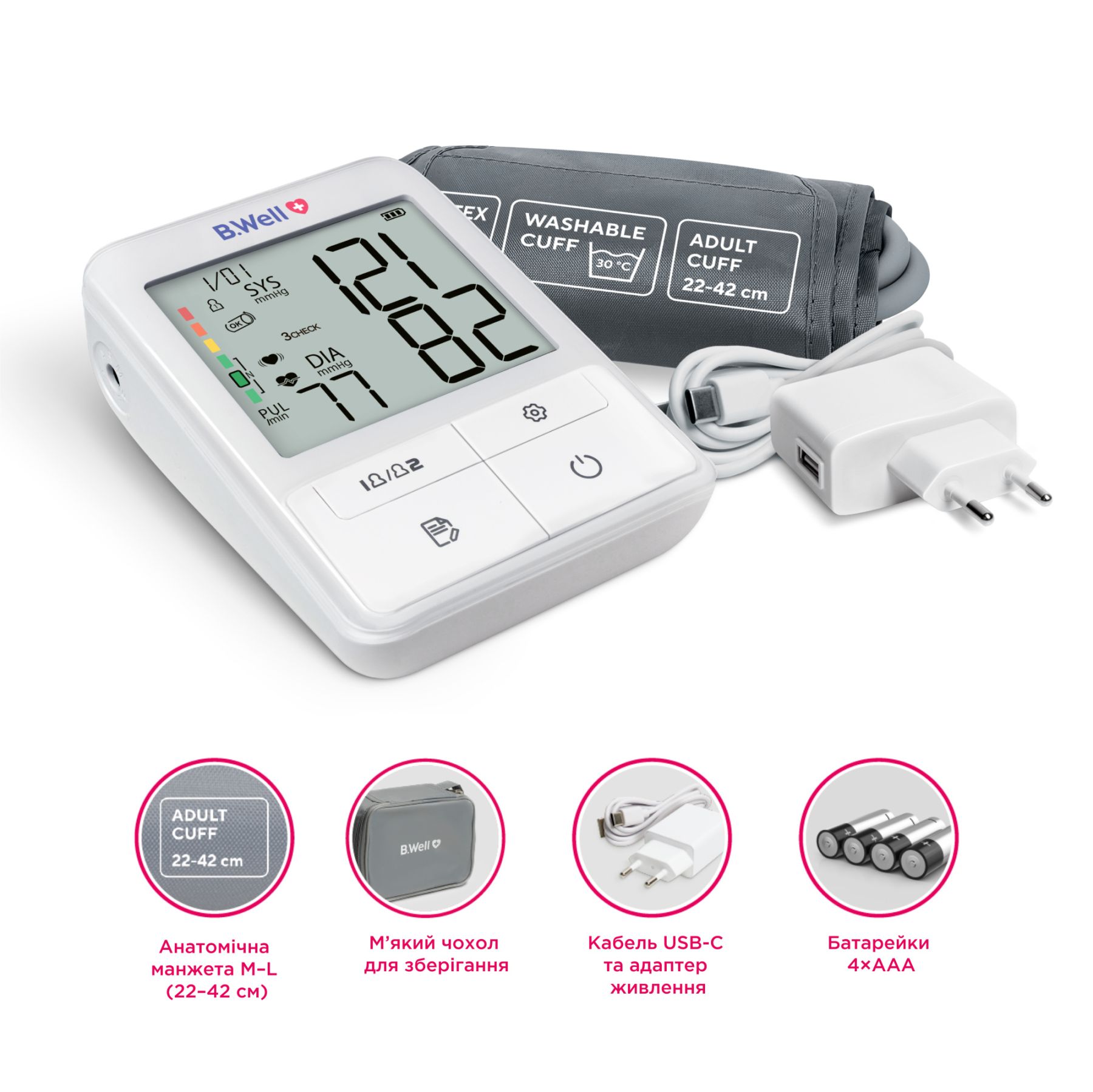 Технологія 3Check Тонометр робить 3 послідовних вимірювання з інтервалом в 15 секунд. Потім виріб проводить аналіз вимірювань, за спеціальним алгоритмом та виводить максимально точний результат. Пам’ять на 2 користувача Об’єм пам’яті дозволяє зберігати до 150 вимірювань для кожного окремо. Дані зберігаються з датою та часом, що дає змогу аналізувати стан здоров’я у зручний час. Зручність у використанні Прилад оснащений великим дисплеєм з чіткими цифрами та простим інтерфейсом управління. Завдяки автоматичному накачуванню манжети користуватися ним може навіть літня людина без сторонньої допомоги. Індикатор аритмії B.Well MED-51 має функцію виявлення нерівномірного серцебиття під час вимірювання. Це допомагає своєчасно звернути увагу на можливі проблеми з серцем та звернутися до лікаря. Анатомічна манжета Вимір тиску з B.Well буде комфортним: анатомічна форма дозволяє уникнути зайвого стиснення руки. Манжета підходить для окружності руки 22–42 см. Показання до застосування