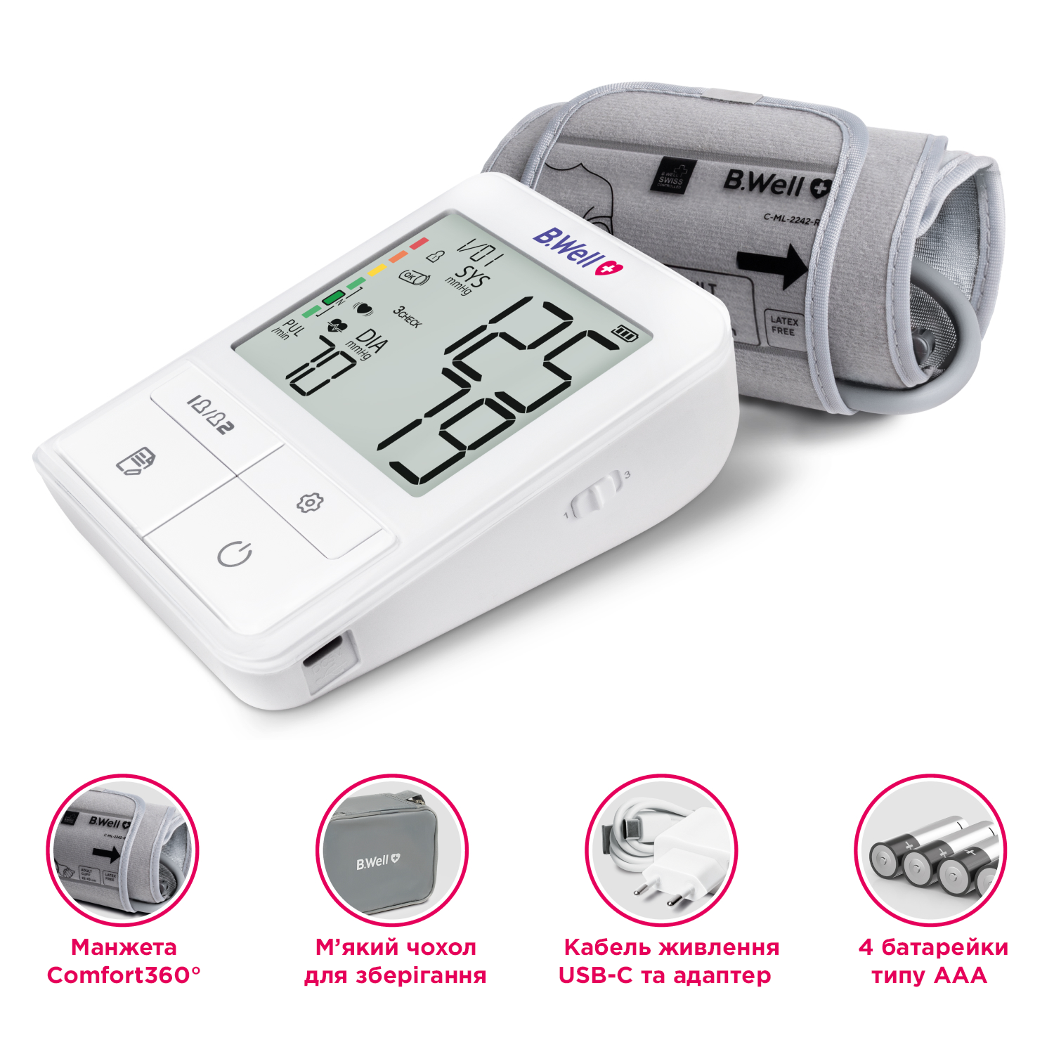 B.Well MED-58 – це сучасний автоматичний тонометр із манжетою Comfort360 та інтелектуальним режимом 3CHECK для максимально точного вимірювання тиску вдома. Спрощений інтерфейс і унікальна манжета роблять прилад зручним навіть для літніх людей.