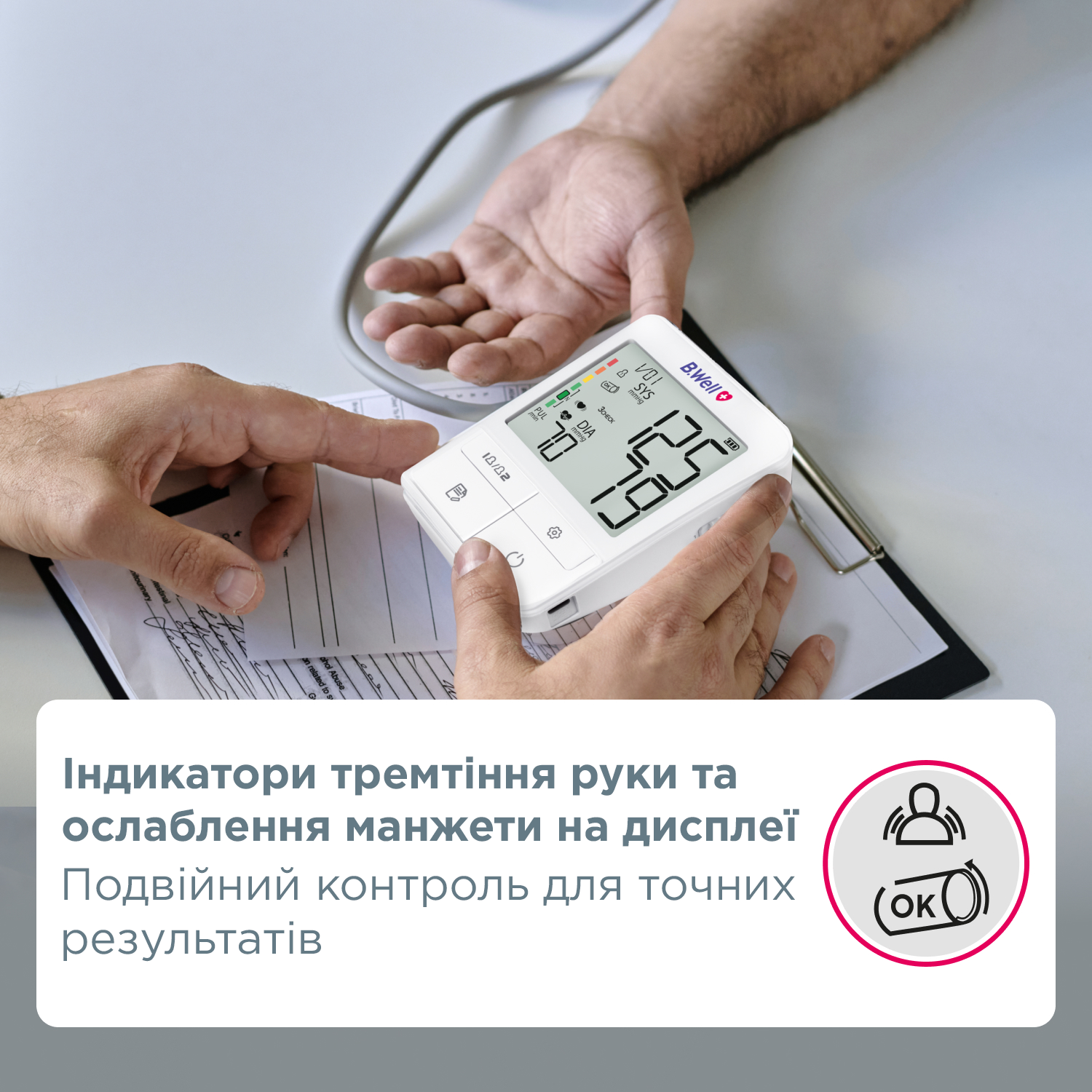 - Індикатор руху руки – сигналізує про можливі похибки під час вимірювання.