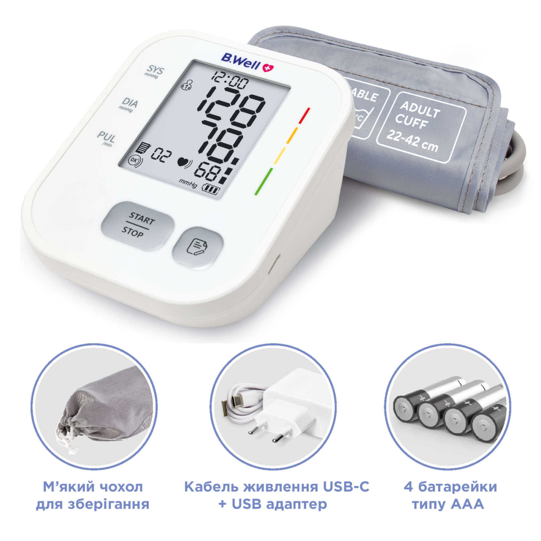 B.Well PRO-25 — сучасний автоматичний тонометр для домашнього та професійного використання. Функція обчислення середнього значення трьох останніх вимірювань забезпечує максимально точний контроль артеріального тиску. Підтримує профілі двох користувачів із памʼяттю по 99 вимірювань кожен.
