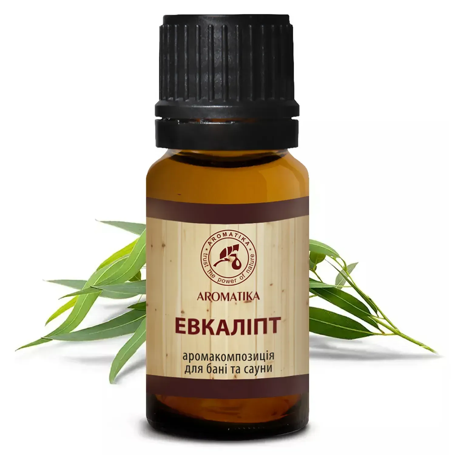 Аромакомпозиція для бані та сауни «Евкаліпт» Ароматика складається з натуральних евкаліптової та м'яти перцевої ефірних олій. Вони мають широкий спектр дії на різні органи та фізіологічні системи організму людини. Камфорний аромат евкаліпта будить резервні сили організму і допомагає відкрити "друге дихання", усуває сонливість і підвищену стомлюваність, посилює концентрацію уваги й покращує розумову діяльність.