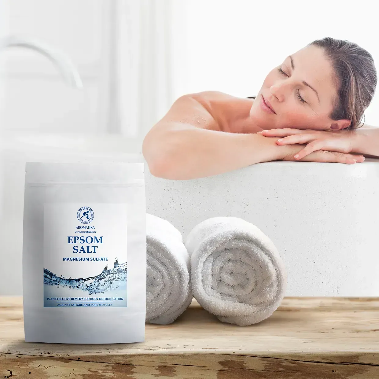 Особливе місце сіль Епсома зайняла в косметології. Вона глибоко очищає пори, пом’якшує грубу, суху шкіру, відлущує мертві клітини, сприяє омолодженню шкіри, дезодорує її, допомагає облегшити симптоми псоріазу та дерматиту. При цьому сіль Епсома (на відміну від інших солей) абсолютно не сушить шкіру! Ванночки з сіллю Епсома являються відмінним засобом для зміцнення нігтів. А ще сіль Епсома виявляється незамінним інгредієнтом обгортання в програмах для схуднення і в боротьбі з целюлітом, вона грає важливу роль у позбавленні організму від токсинів і солей тяжких металів. При догляді за волоссям сприяє усуненню лупи, бореться з посіченим волоссям, додає йому здорового вигляду, об'єму і блиску.