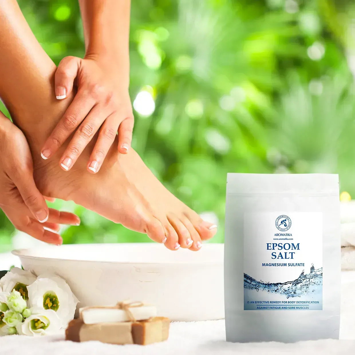 ► Ванночка для ніг: зробіть розчин з половиною стакана солі Епсома на 5 літрів теплої води (+37 °С – +38 °С), приймайте 5-10 хвилин. Після промийте ноги чистою водою. Така процедура зменшує втому, заспокоює біль, усуне неприємний запах і пом'якшить шкіру ніг.