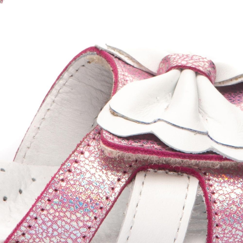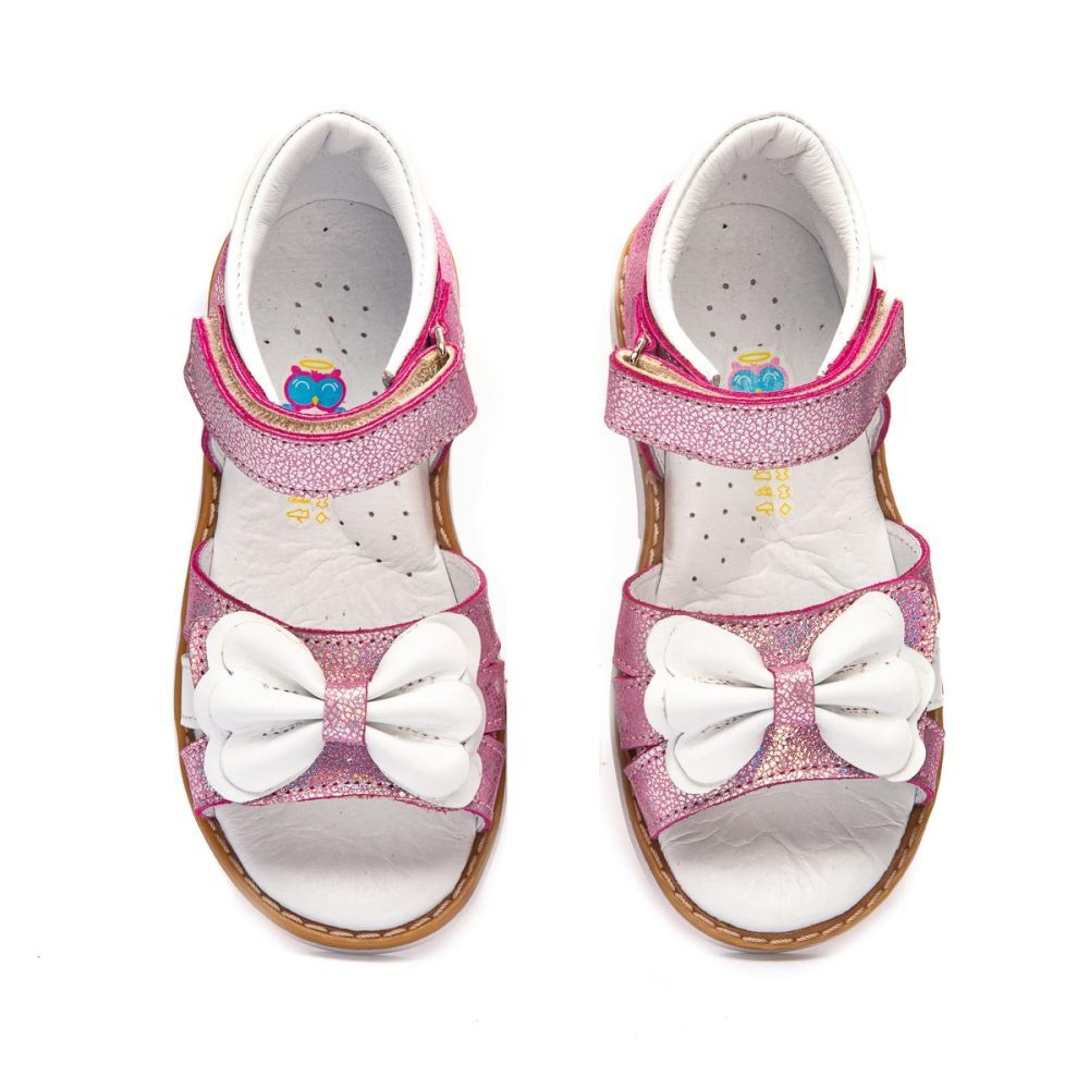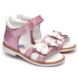 Модні та оригінальні босоніжки THEO LEO 1244 виконані з натуральної шкіри у рожевому перламутрі з красивим білим бантом.