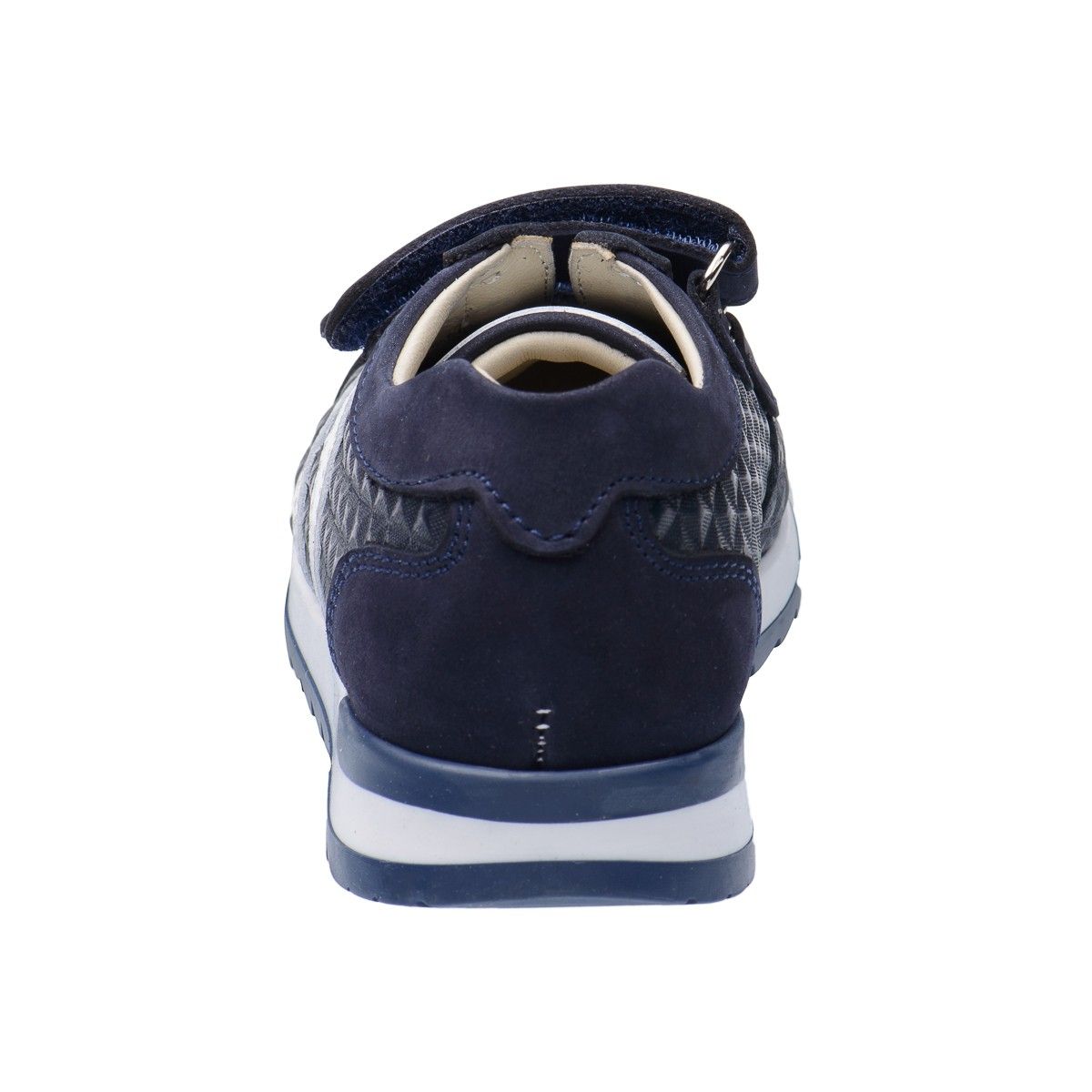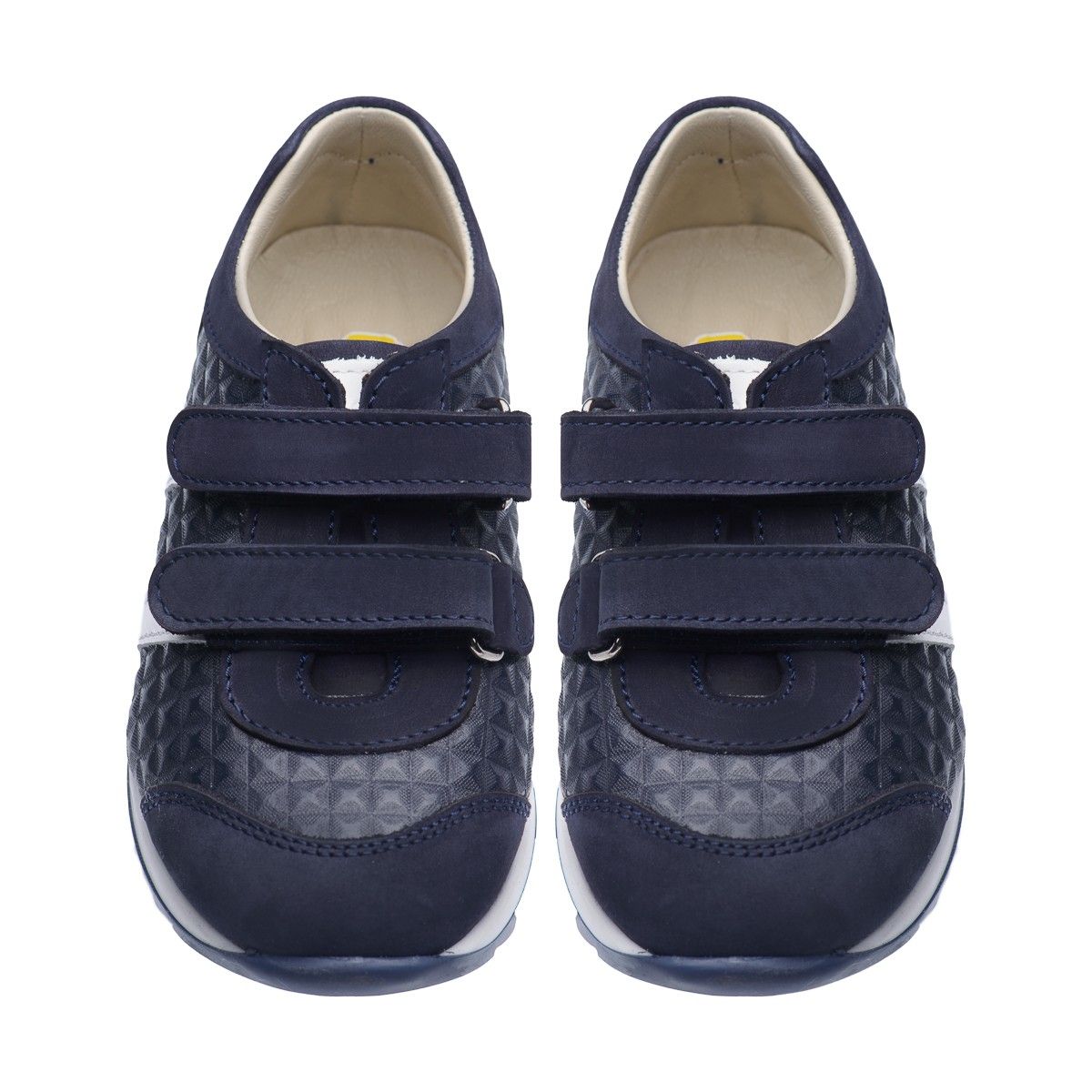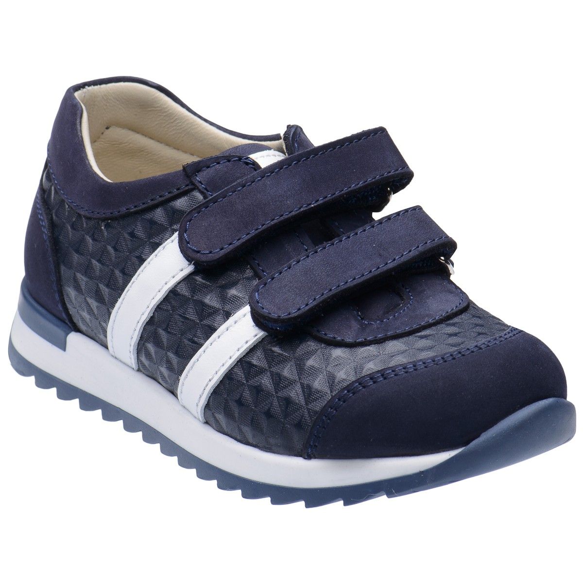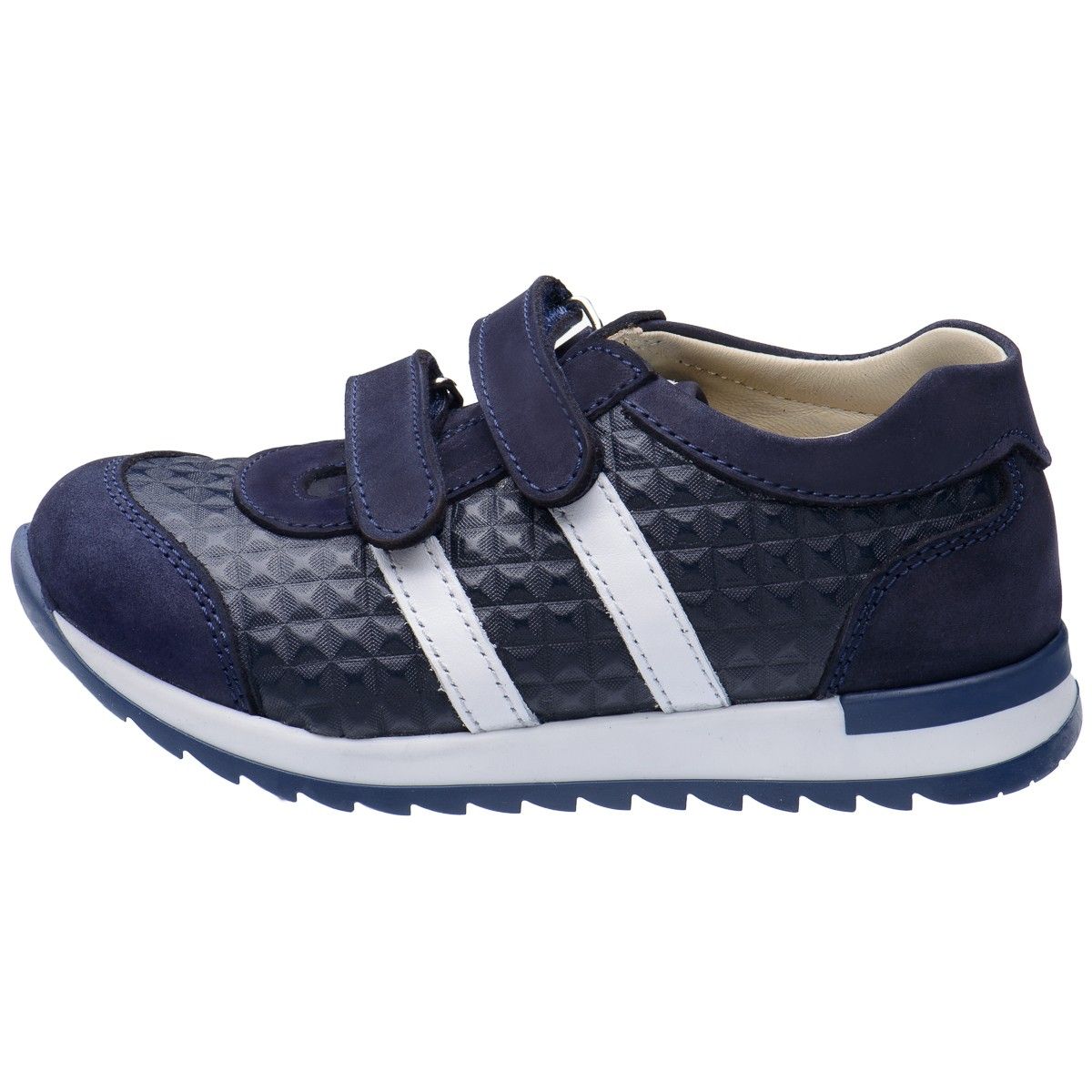 Theo Leo 016 - кросівки виконані з натуральної шкіри темно синього кольору. Модель декорована вставками з нубуку темно синього кольору і білими зі шкіри. Устілка і підкладка - натуральна шкіра. Присутній анатомічний супінатор, модель на липучках. Підошва біло-синього кольору виконана з термопластичної гуми, не ковзає і добре амортизує.