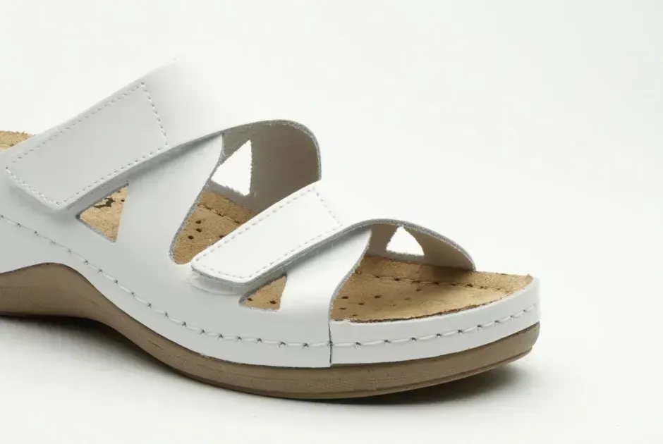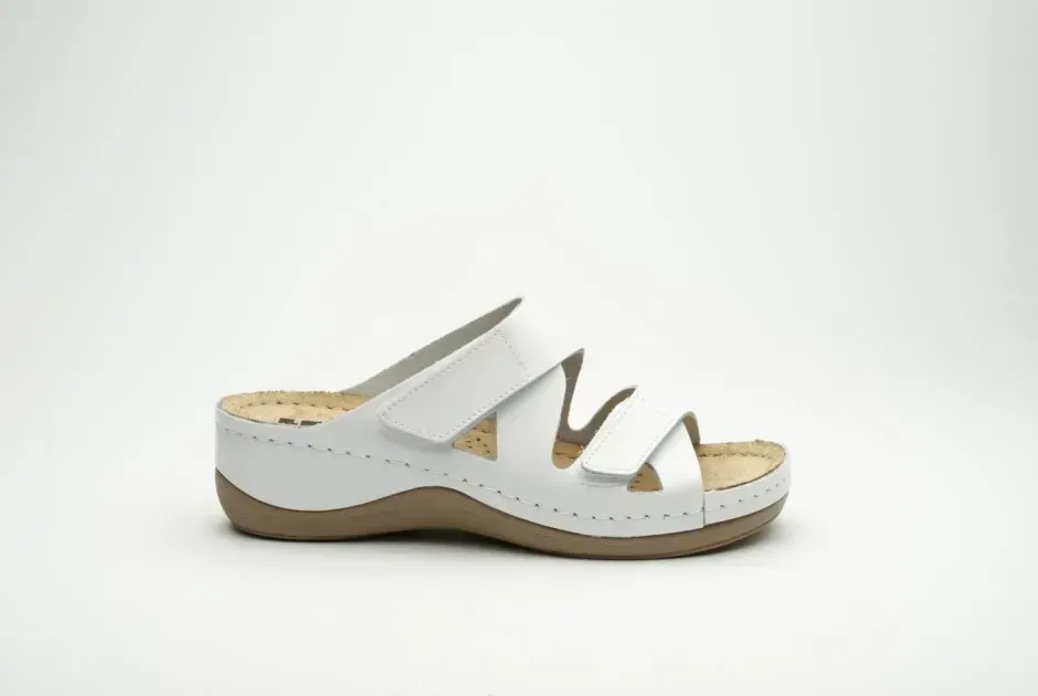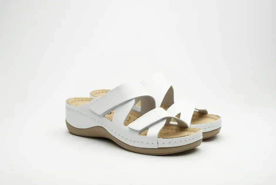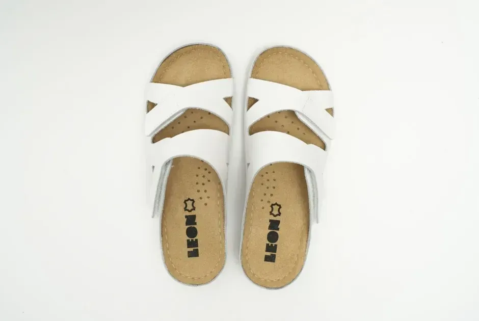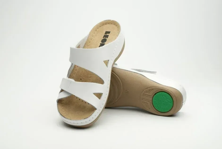 Жіночі шльопанці Leon Білий 906 ортопедія. Характеристики: Артикул: 906 Білий, Колір: Білий, Матеріал верху: Натуральна шкіра, Вид підкладки: Масажний гель / меморі-піна, Матеріал підошви: поліуретан і протектор проти ковзання, Країна виробник: Сербія.