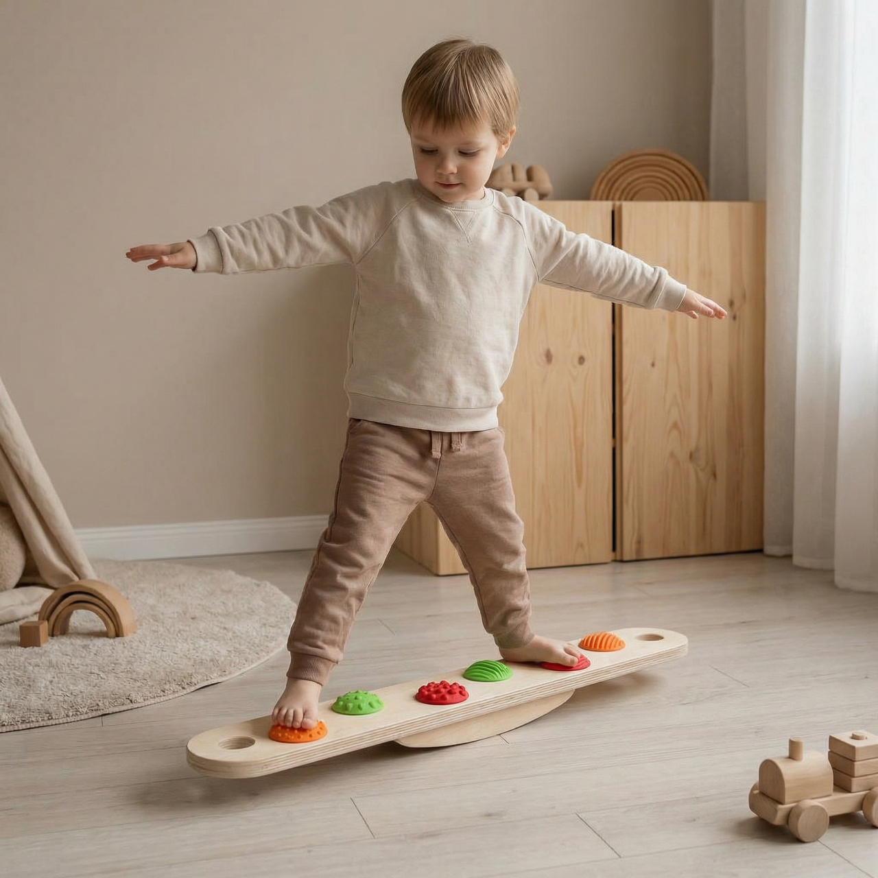 - 5 балансировочных досок — размер каждой доски 60 см x 9 см, что идеально подходит для маленьких ножек.