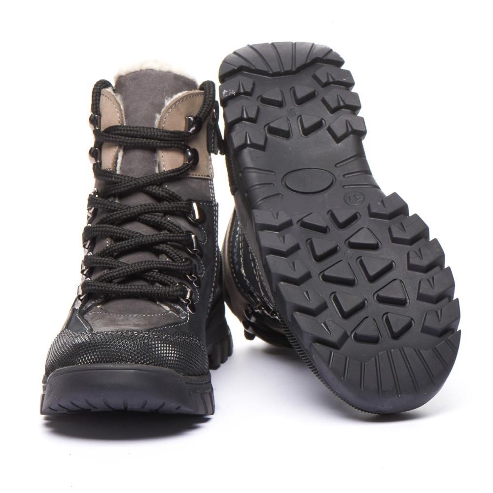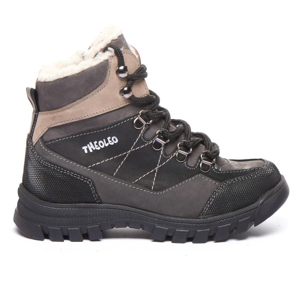 Theo Leo 1407 якісні зимові ортопедичні черевики для активної дитини виконані з натурального нубуку, у чорному з сірими і коричневими вставками. Мають прогумований носок. Модель поєднує в собі високу якість і комфорт, створена для тривалих прогулянок і активних ігор.