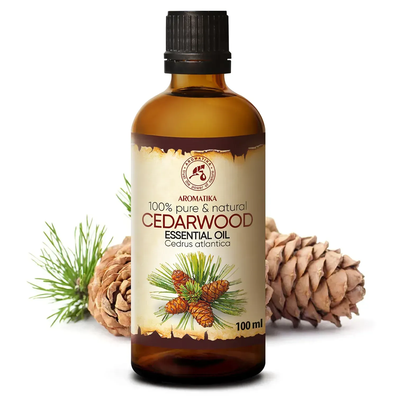 Кедрова ефірна олія Ароматика – це ефірна олія, отримана з деревини кедра атласького. Цей продукт своїм свіжим ароматом подумки перенесе Вас у високогірний багатовіковий ліс, що освіжає, щоб вдихнути на повні груди та емоційно перезавантажитися, що позитивно позначиться на Вашій працездатності. Гармонізує думки та почуття, породжує відчуття затишку, спокою, захищеності та стабільності. Ефірна олія з кедра атласького використовується як віддушка та фіксатор у виробництві косметики та парфумерних виробів як жіночих, так і в чоловічих. Вона має дезодоруючу, регенеруючу та антисептичну дію, тому може застосовуватися у чоловічих засобах гігієни, зокрема у лосьйонах після гоління. Косметологи рекомендують цю олію для догляду за жирною шкірою або проти акне, а перукарі та трихологи – для догляду за жирним волоссям та в боротьбі з облисінням.