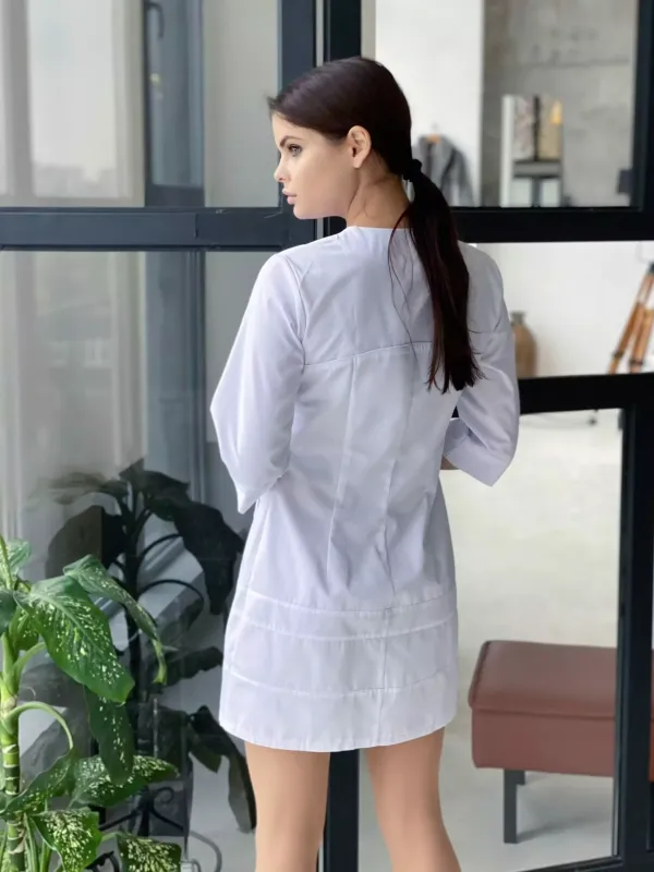 Сучасна модель медичного халата "Рубіна" виконана в класичному стилі з приємного на дотик котону.Застібки на кнопках рукав довгий.