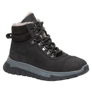 Theo Leo 3273KR це зручна модель зимового взуття спортивного стилю. Дитячі зимові черевики пошиті з натуральної шкіри нубук чорного кольору. Матеріал підкладки та устілки - натуральна вовна. В моделі чудово регулюється повнота та гарно фіксується ніжка завдяки шнурівці. Бокову частину черевик декорована темними вставками.