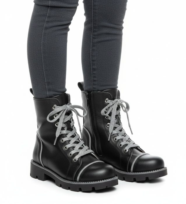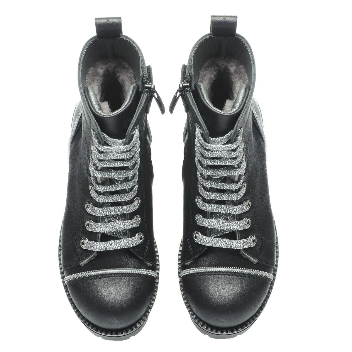 Theo Leo 0133 - стильні зимові черевики для дівчинки з натуральної шкіри. Модель на блискавці, декорована шнурками сріблястого кольору. Підкладка та устілка - натуральне хутро. Анатомічна устілка з суппінатором підтримує поздовжнє склепіння стопи. Підошва - термопластична гума, рифлена, не ковзає і добре амортизує.