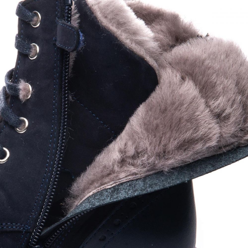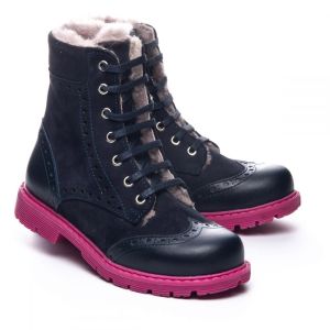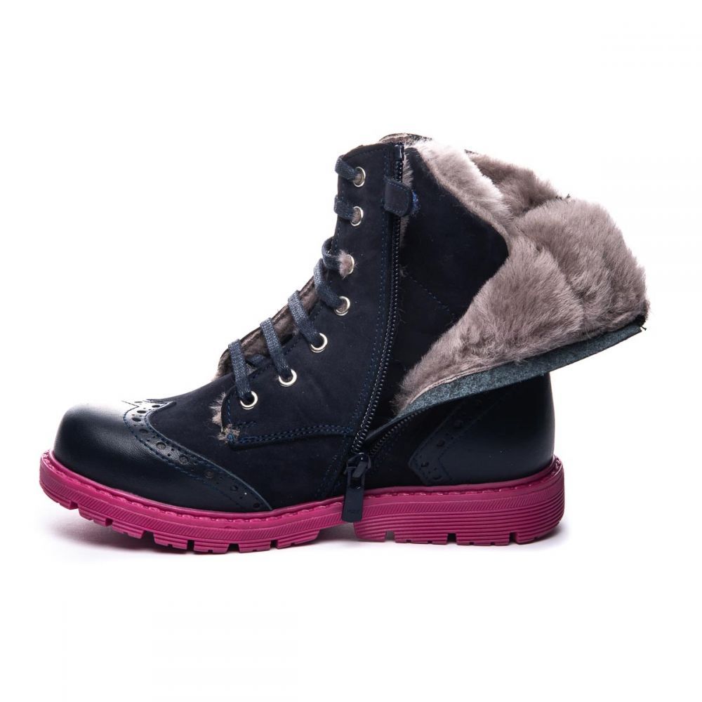 Theo Leo 1070 - яскраві зимові черевики з натуральної шкіри і нубука темно синього кольору. Взуття на блискавки, на модній підошві рожевого кольору. Модель декорована стильною перфорацією. Всередині - натуральне хутро. У взутті супінатор, каблук Томаса і анатомічна устілка. Підошва - термопластіковая гума, не ковзає і добре амортизує.