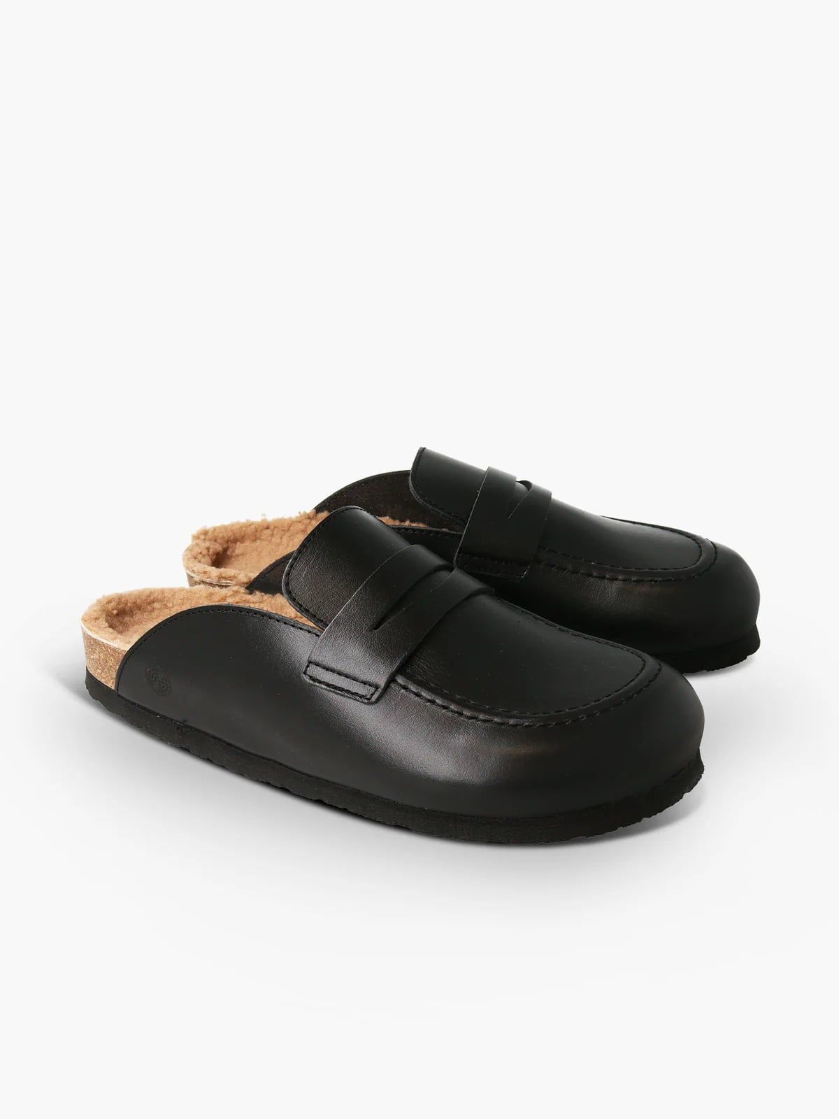 Сабо Lois чорного кольору, в стилі Penny loafer з анатомічною підошвою та устілкою з натурального хутра від Genuin. Поєднують затишок домашніх капців і зовнішній вигляд сабо, тому їх можна носити і вдома, і на вулиці. Виготовлені із декоративною деталлю “penny slot” на шкіряному ремінці на верхній частині, з закритою переднею частиною та відкритою п’ятою та видимим декоративним зшиванням. Надзвичайно зручне модне взуття з максимальним комфортом без шкоди для моди та останніх тенденцій.
