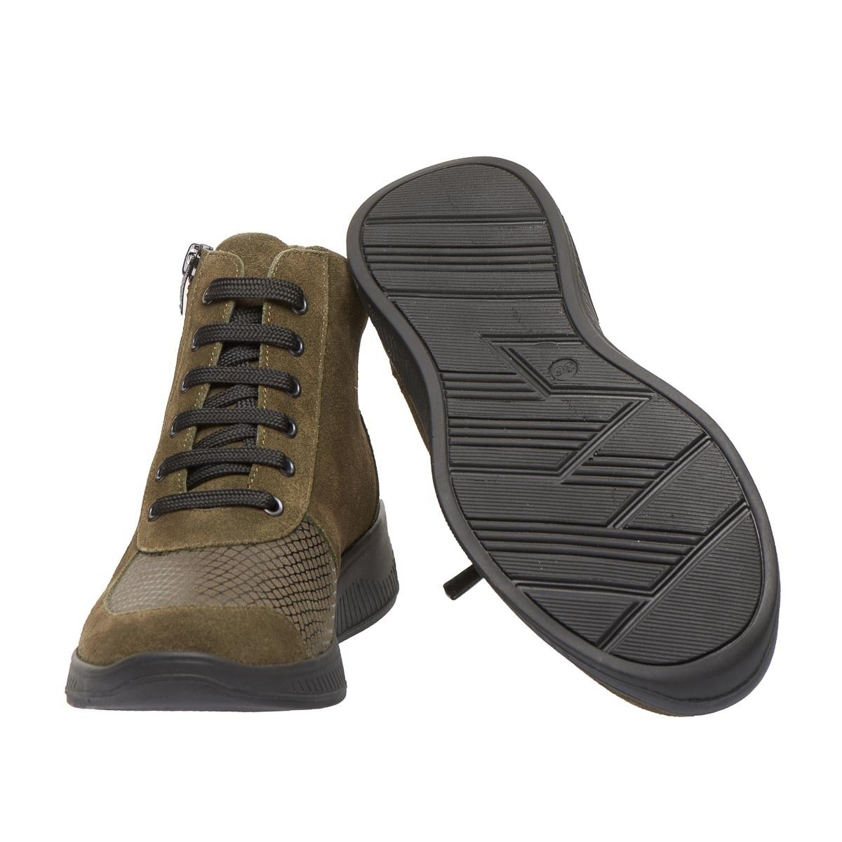 Зручне демісезонне взуття виготовлене з натуральної замшевої шкіри, кольору хакі, забезпечує максимальну зручність, допоможе при профілактиці та лікуванні плоскостопості будь якого типу чи вальгусної деформації. Взуття створене для широкої стопи ноги, з використанням інноваційних матеріалів, надлегке, зменшує тиск на суглоб великого пальця стопи, сприяючи комфорту та мобільності.