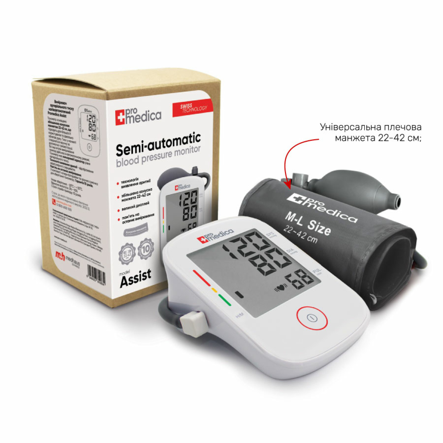 Електронний тонометр ProMedica Assist – це напівавтоматичний цифровий вимірювач артеріального тиску та пульсу. Зберігає в пам’яті значення останнього вимірювання, має універсальну манжету 22–42 см, що підходить більшості користувачів.