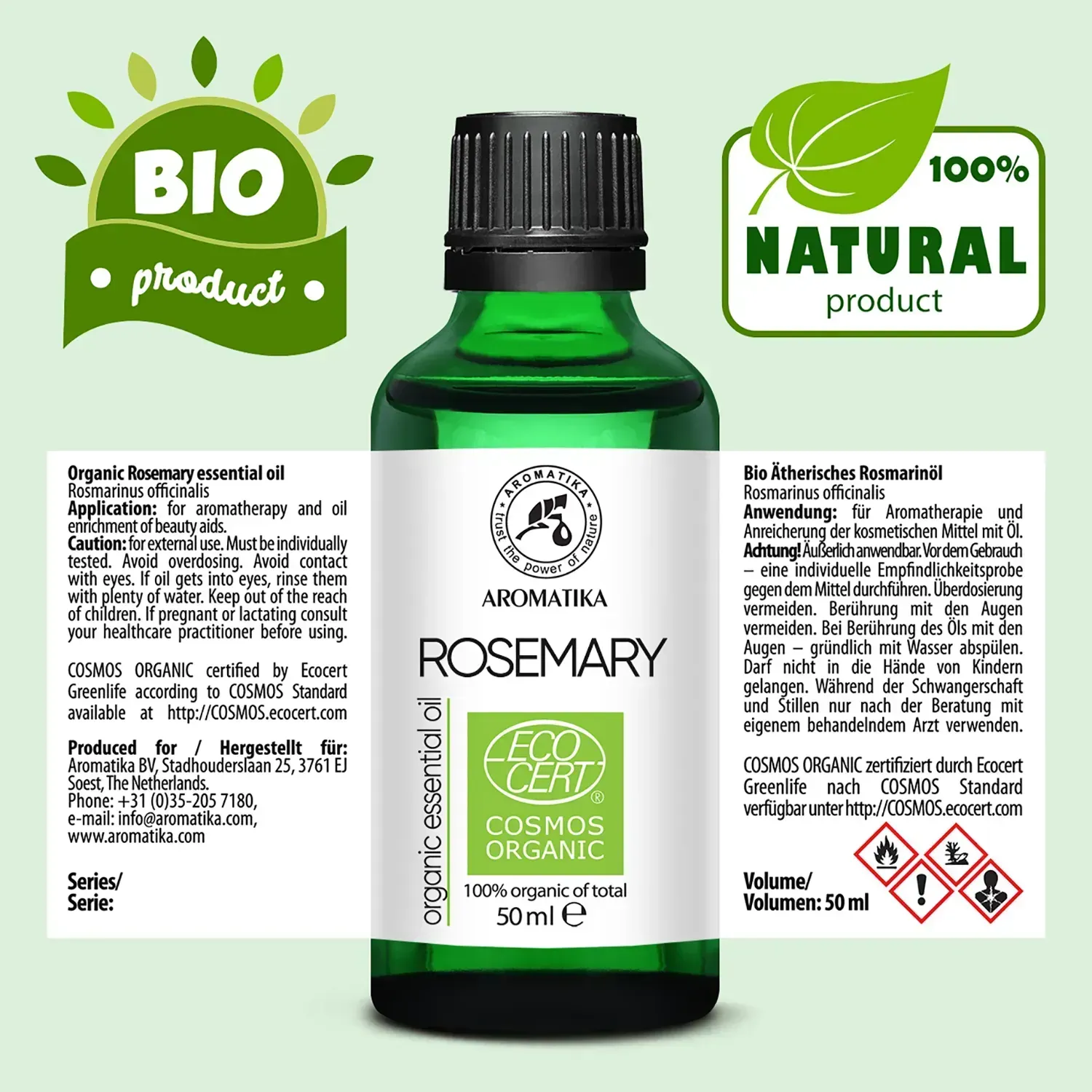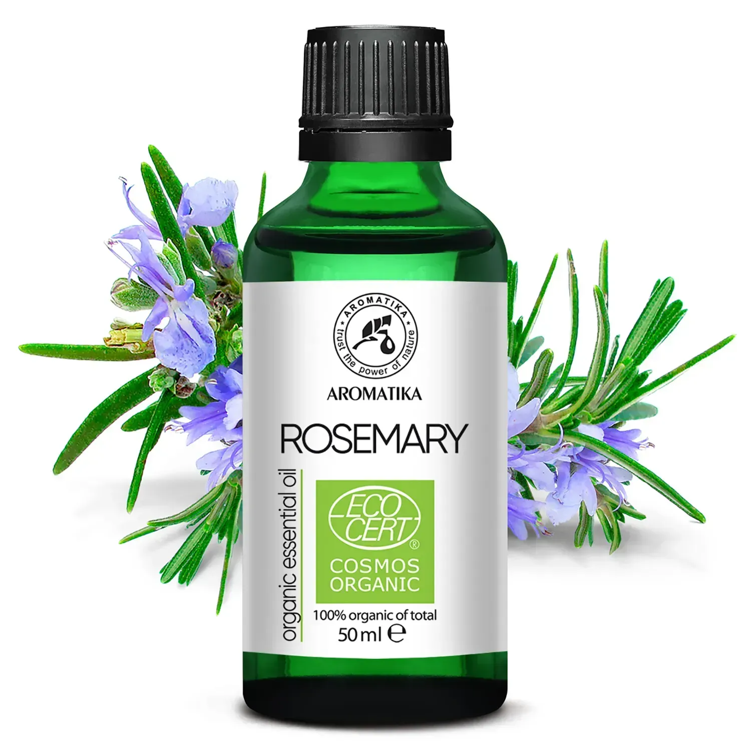 Органічна ефірна олія розмаринова – це ефірна олія, отримана з надземної частини вічнозеленого чагарнику розмарину лікарського, сировина для якої вирощувалась в екологічно чистих районах. Ефірна олія не містить пестицидів, ГМО, наноматеріалів, феноксіетанолу, синтетичних домішок, ароматизаторів чи барвників. Екологічність цього косметичного продукту підтверджено сертифікатом ECOCERT (ЕКОСЕРТ), виданим відповідним органом по сертифікації та контролю органічних продуктів, створеним у Франції в 1991 році. Працюючи в більш ніж 80 країнах, він став однією з найбільших організацій по сертифікації органічних продуктів у світі та одним з найвідоміших лейблів в галузі стандартизації натуральної косметики. Стандарт Ecocert встановлює, що інгредієнти отримані з поновлюваних ресурсів і зроблені з використанням екологічно безпечних процесів. Ефірна олія розмарину від бренду Ароматика сертифікована Ecocert Greenlife за стандартом COSMOS ORGANIC, за що має відповідне маркування на етикетці.