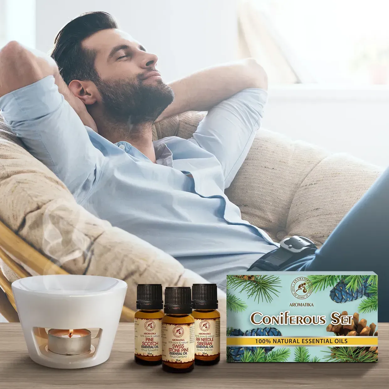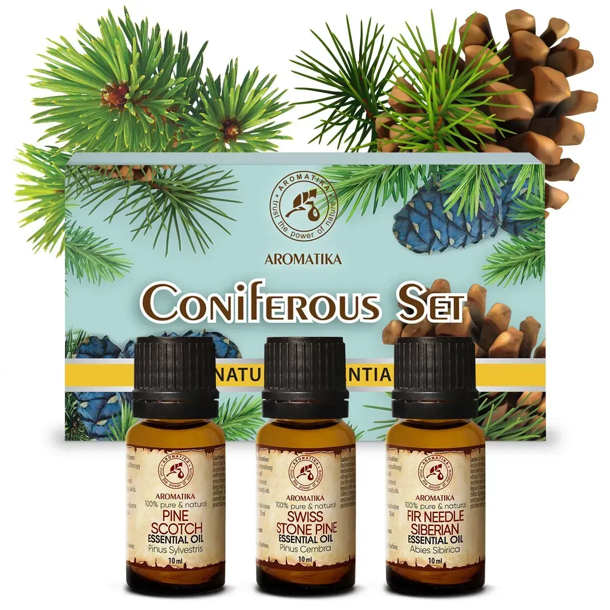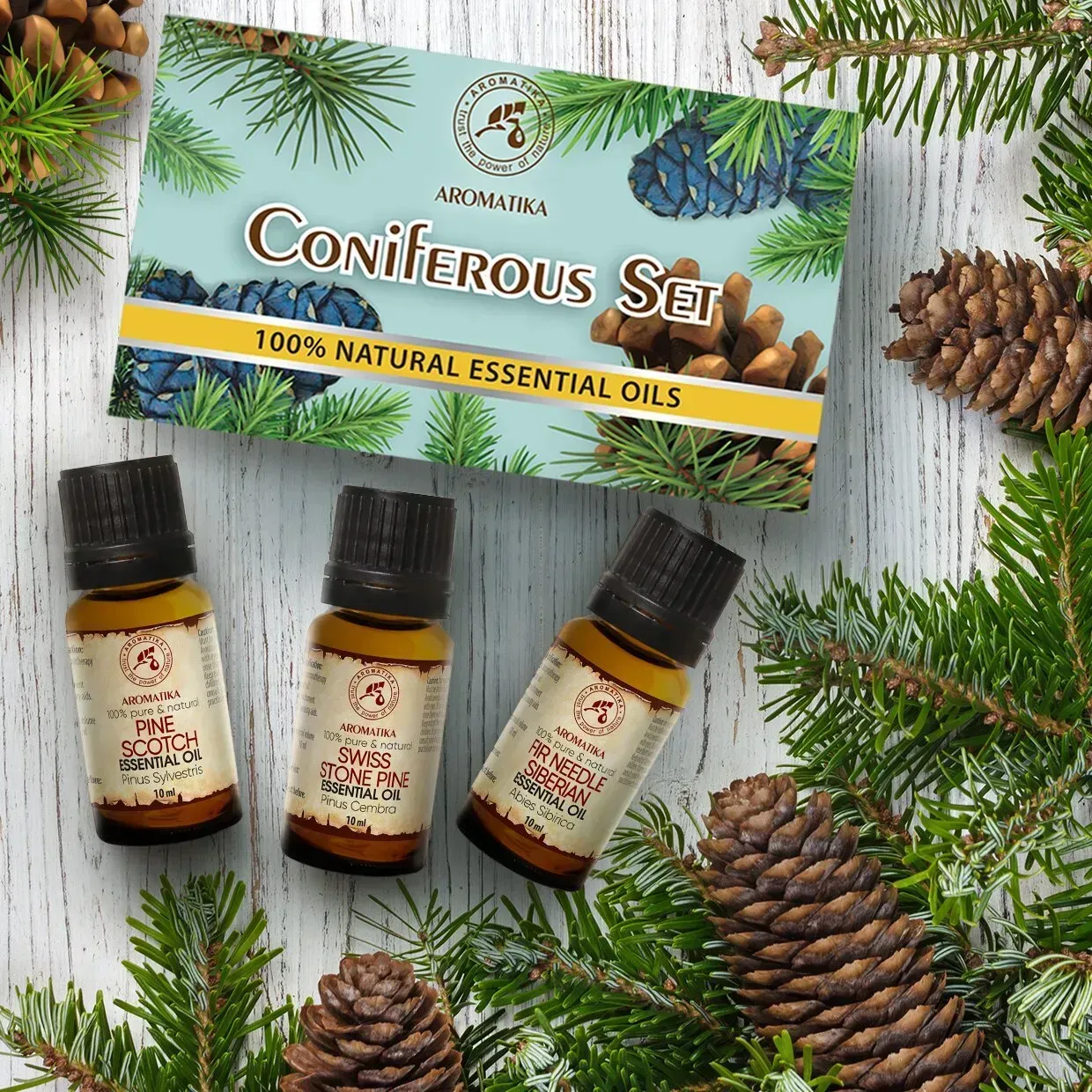 Хвойні ефірні олії також володіють яскраво вираженою бактерицидною, антисептичною, протизапальною, противірусною, відхаркувальною дією. Особливо корисні соснові та ялицеві ефірні олії в міжсезоння і холодну пору року для додаткового лікування або профілактики простудних захворювань. При вдиханні ефірні олії хвойних підсилюють роботу бронхів, а це покращує розрідження мокротиння та його вихід. Хвойні олії дуже часто використовуються в лазнях і саунах в якості натуральних ароматизаторів, як сильні антисептики вони вбивають практично всі відомі шкідливі мікроорганізми та підходять для оздоровлення шкіри. Засоби з набору також допомагають при хронічній втомі та стресі, тонізують, відновлюють душевну рівновагу і стимулюють розумову діяльність. Ефірні олії випускаються в яскравій і красивій коробці та можуть стати відмінним подарунком для Ваших рідних і близьких.